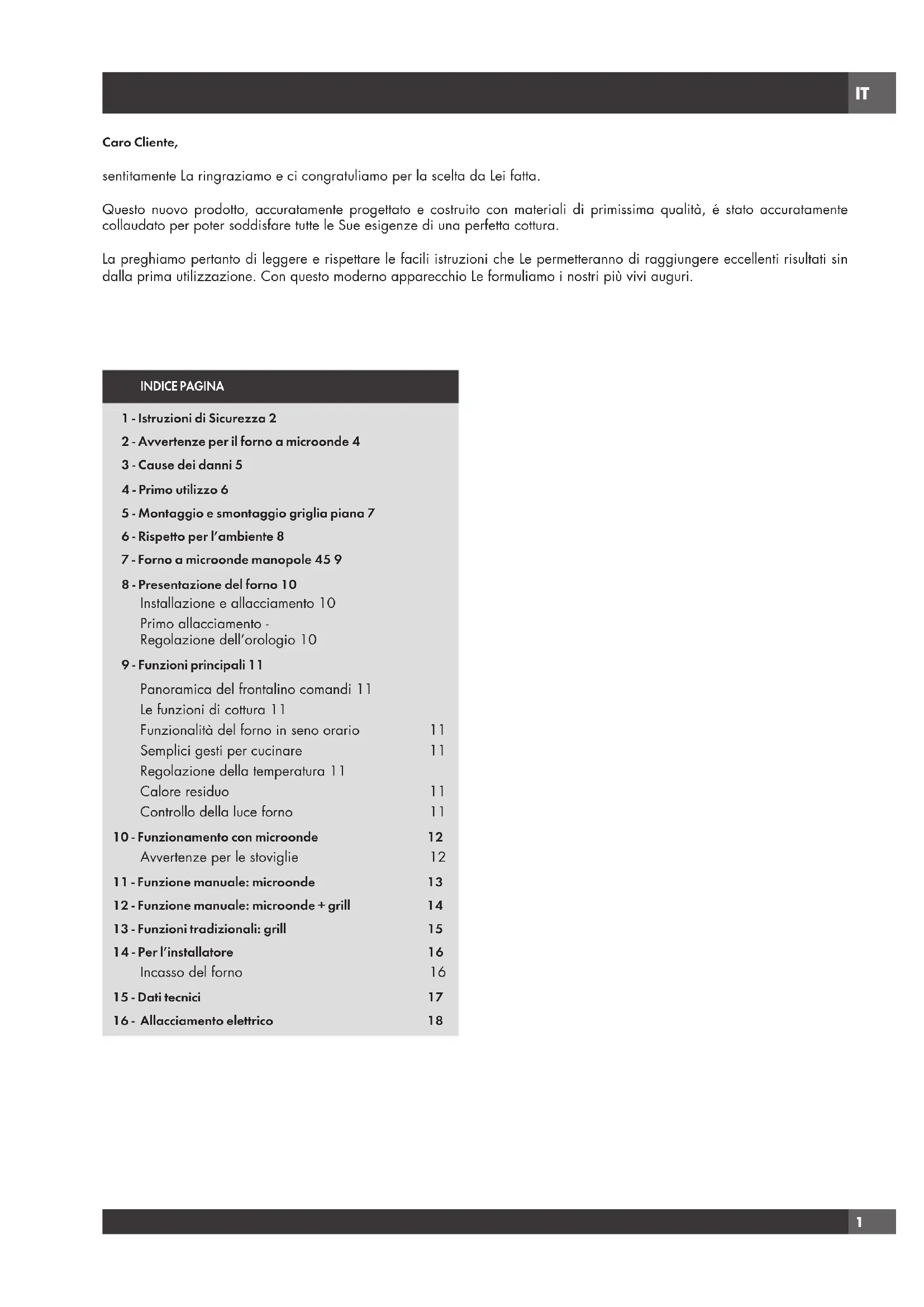 Caro Cliente, sentitamente La ringraziamo e ci congratuliamo per la scelta da Lei fatta. Questo nuovo prodotto, accuratamente progettato e costruito con materiali di primissima qualità, é stato accuratamente collaudato per poter soddisfare tutte le Sue esigenze di una perfetta cottura. La preghiamo pertanto di leggere e rispettare le facili istruzioni che Le permetteranno di raggiungere eccellenti risultati sin dalla prima utilizzazione. Con questo moderno apparecchio Le formuliamo i nostri più vivi auguri.IT