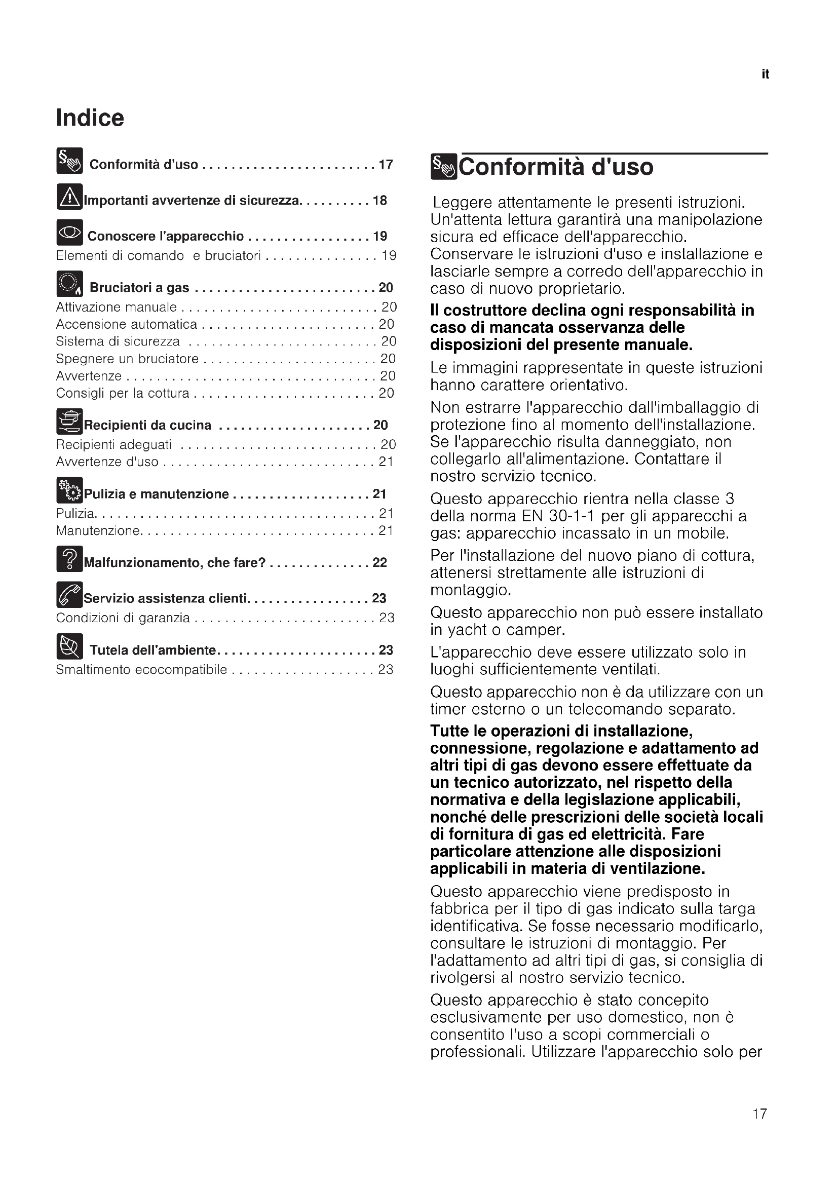 - Conoscere l'apparecchio . . . . . . . . . . . . . . . . . 19 Elementi di comando e bruciatori . . . . . . . . . . . . . . . 19 Ä Bruciatori a gas . . . . . . . . . . . . . . . . . . . . . . . . . 20 Attivazione manuale . . . . . . . . . . . . . . . . . . . . . . . . . . 20 Accensione automatica . . . . . . . . . . . . . . . . . . . . . . . 20 Sistema di sicurezza . . . . . . . . . . . . . . . . . . . . . . . . . 20 Spegnere un bruciatore . . . . . . . . . . . . . . . . . . . . . . . 20 Avvertenze . . . . . . . . . . . . . . . . . . . . . . . . . . . . . . . . . 20 Consigli per la cottura . . . . . . . . . . . . . . . . . . . . . . . . 20 Å Recipienti da cucina . . . . . . . . . . . . . . . . . . . . . 20 Recipienti adeguati . . . . . . . . . . . . . . . . . . . . . . . . . . 20 Avvertenze d'uso . . . . . . . . . . . . . . . . . . . . . . . . . . . . 21 2 Pulizia e manutenzione . . . . . . . . . . . . . . . . . . . 21 Pulizia. . . . . . . . . . . . . . . . . . . . . . . . . . . . . . . . . . . . . 21 Manutenzione. . . . . . . . . . . . . . . . . . . . . . . . . . . . . . . 21 3 Malfunzionamento, che fare? . . . . . . . . . . . . . . 22 4 Servizio assistenza clienti. . . . . . . . . . . . . . . . . 23 Condizioni di garanzia . . . . . . . . . . . . . . . . . . . . . . . . 23 7 Tutela dell'ambiente. . . . . . . . . . . . . . . . . . . . . . 23 Smaltimento ecocompatibile . . . . . . . . . . . . . . . . . . . 23 8Conformità d'uso Co n f o r mità d' uso Leggere attentamente le presenti istruzioni. Un'attenta lettura garantirà una manipolazione sicura ed efficace dell'apparecchio. Conservare le istruzioni d'uso e installazione e lasciarle sempre a corredo dell'apparecchio in caso di nuovo proprietario. Il costruttore declina ogni responsabilità in caso di mancata osservanza delle disposizioni del presente manuale. Le immagini rappresentate in queste istruzioni hanno carattere orientativo. Non estrarre l'apparecchio dall'imballaggio di protezione fino al momento dell'installazione. Se l'apparecchio risulta danneggiato, non collegarlo all'alimentazione. Contattare il nostro servizio tecnico. Questo apparecchio rientra nella classe 3 della norma EN 30-1-1 per gli apparecchi a gas: apparecchio incassato in un mobile. Per l'installazione del nuovo piano di cottura, attenersi strettamente alle istruzioni di montaggio. Questo apparecchio non può essere installato in yacht o camper. L'apparecchio deve essere utilizzato solo in luoghi sufficientemente ventilati. Questo apparecchio non è da utilizzare con un timer esterno o un telecomando separato. Tutte le operazioni di installazione, connessione, regolazione e adattamento ad altri tipi di gas devono essere effettuate da un tecnico autorizzato, nel rispetto della normativa e della legislazione applicabili, nonché delle prescrizioni delle società locali di fornitura di gas ed elettricità. Fare particolare attenzione alle disposizioni applicabili in materia di ventilazione. Questo apparecchio viene predisposto in fabbrica per il tipo di gas indicato sulla targa identificativa. Se fosse necessario modificarlo, consultare le istruzioni di montaggio. Per l'adattamento ad altri tipi di gas, si consiglia di rivolgersi al nostro servizio tecnico. Questo apparecchio è stato concepito esclusivamente per uso domestico, non è consentito l'uso a scopi commerciali o professionali. Utilizzare l'apparecchio solo perit Importanti avvertenze di sicurezza