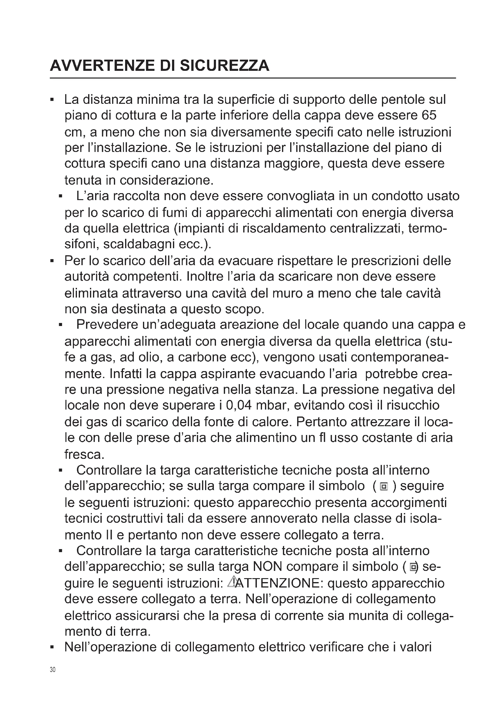 - Prevedere un’adeguata areazione del locale quando una cappa e apparecchi alimentati con energia diversa da quella elettrica (stu- fe a gas, ad olio, a carbone ecc), vengono usati contemporanea- mente. Infatti la cappa aspirante evacuando l’aria potrebbe crea- re una pressione negativa nella stanza. La pressione negativa del locale non deve superare i 0,04 mbar, evitando così il risucchio dei gas di scarico della fonte di calore. Pertanto attrezzare il loca- le con delle prese d’aria che alimentino un fl usso costante di aria fresca.