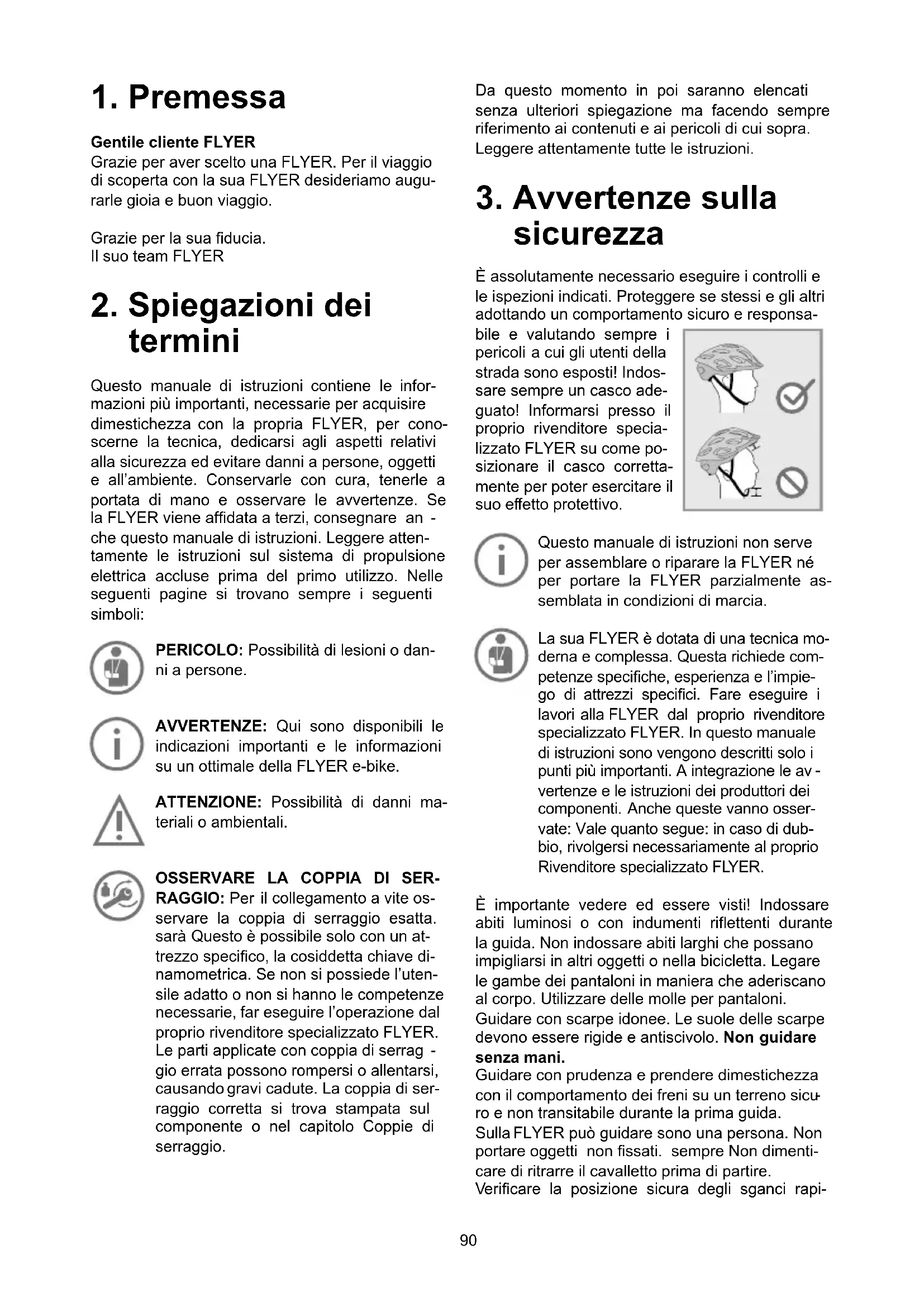 sicurezza È assolutamente necessario eseguire i controlli e le ispezioni indicati. Proteggere se stessi e gli altri adottando un comportamento sicuro e responsa- bile e valutando sempre i pericoli a cui gli utenti della strada sono esposti! Indos- sare sempre un casco ade- guato! Informarsi presso il proprio rivenditore specia- lizzato FLYER su come po- sizionare il casco corretta- mente per poter esercitare il suo ef fetto protettivo. Questo manuale di istruzioni non serve per assemblare o riparare la FLYER né per portare la FLYER parzialmente as- semblata in condizioni di marcia. La sua FLYER è dotata di una tecnica mo- derna e complessa. Questa richiede com- petenze speciche, esperienza e l’impie- go di attrezzi specici. Fare eseguire i lavori alla FLYER dal proprio rivenditore specializzato FLYER. In questo manuale di istruzioni sono vengono descritti solo i punti più importanti. A integrazione le av