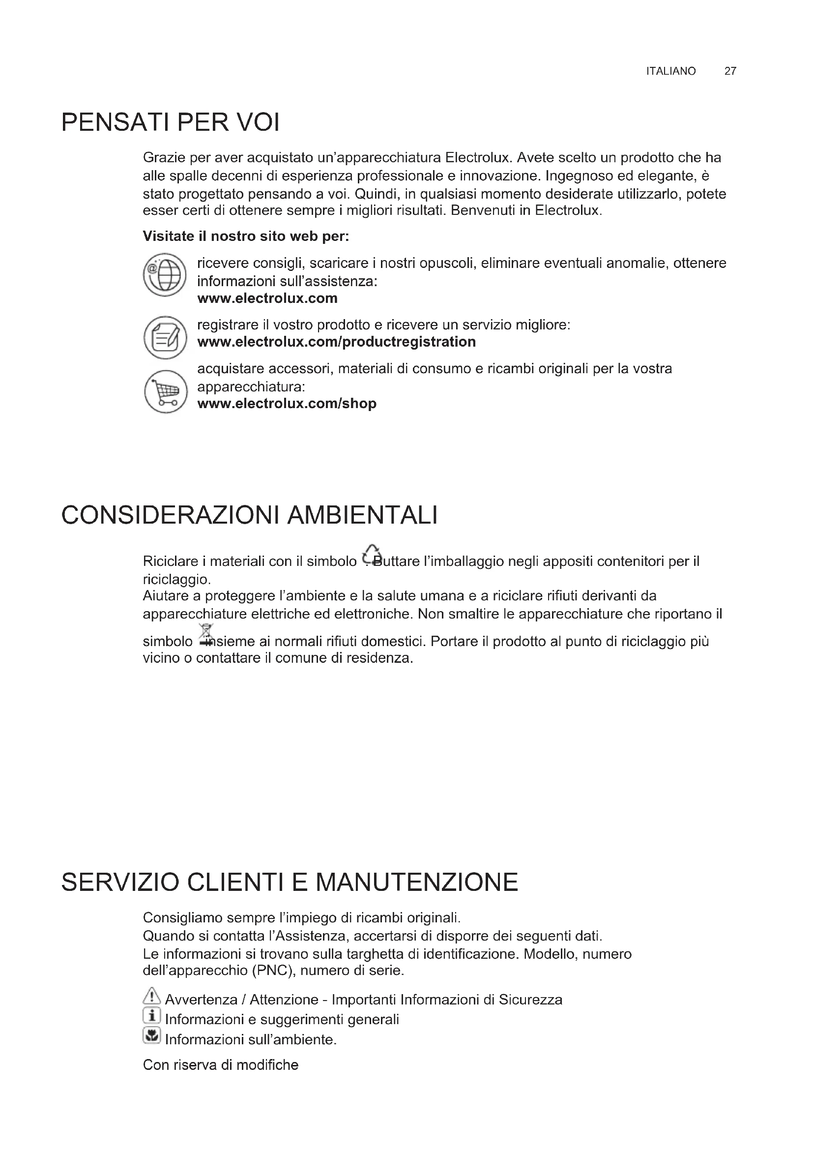 Consigliamo sempre l’impiego di ricambi originali. Quando si contatta l’Assistenza, accertarsi di disporre dei seguenti dati. Le informazioni si trovano sulla targhetta di identificazione. Modello, numero dell’apparecchio (PNC), numero di serie. Avvertenza / Attenzione - Importanti Informazioni di Sicurezza Informazioni e suggerimenti generali Informazioni sull’ambiente. Con riserva di modifiche IT LIBRETTO DI USOwww.electrolux.com