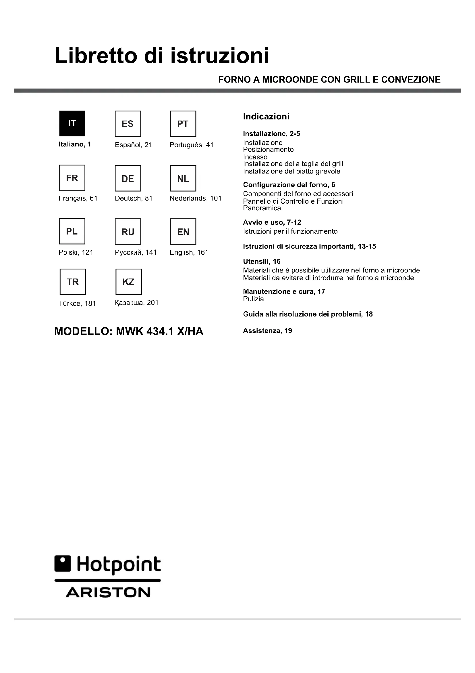 MANUALE UTENTE MWK 434.1 XHA HOTPOINT-ARISTON
