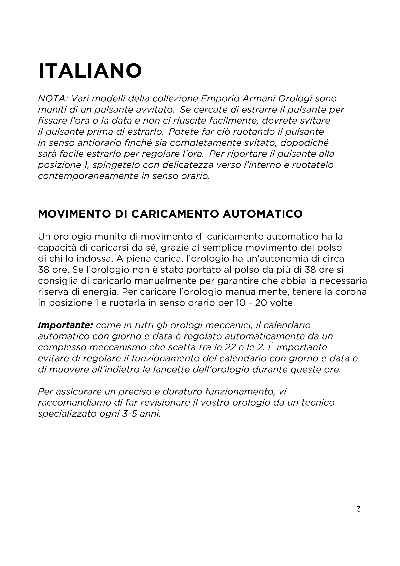 - Nous recommandons de faire inspecter la montre tous les deux ans envi rons pour assurer qu’elle fonctionne pendant longtemps et sans probléme.3 ITALIANO NOTA: Vari modelli della collezione Emporio Armani Orologi sono muniti di un pulsante avvitato. Se cercate di estrarre il pulsante per fissare l’ora o la data e non ci riuscite facilmente, dovrete svitare il pulsante prima di estrarlo. Potete far ciò ruotando il pulsante in senso antiorario finché sia completamente svitato, dopodiché sarà facile estrarlo per regolare l’ora. Per riportare il pulsante alla posizione 1, spingetelo con delicatezza verso l’interno e ruotatelo contemporaneamente in senso orario.