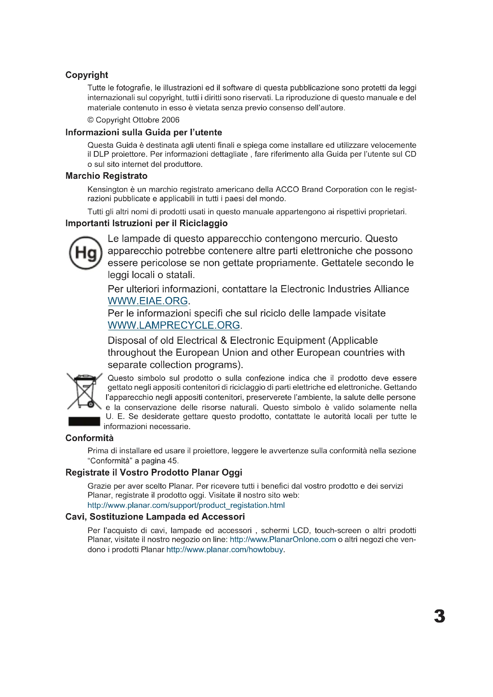 Planar Systems, Inc. Корпоративный Штаб 1195 NW Compton Drive, USA Beaverton, OR 97006-1992 Planar Поддержка Клиента Телефон: США: 1-866-PLANAR1 (866) 752-6271 Внутри США: +1 (503) 748-5799 E-mail: PlanarSupport@planar.com Онлайн Техническая Библиотека: http://www.planar.com/support Часы: M-F, 8am - 8pm ET, 12pm - 12am GMT3 Copyright Tutte le fotografi e, le illustrazioni ed il software di questa pubblicazione sono protetti da leggi internazionali sul copyright, tutti i diritti sono riservati. La riproduzione di questo manuale e del materiale contenuto in esso è vietata senza previo consenso dell’autore. © Copyright Ottobre 2006 Informazioni sulla Guida per l’utente Questa Guida è destinata agli utenti fi nali e spiega come installare ed utilizzare velocemente il DLP proiettore. Per informazioni dettagliate , fare riferimento alla Guida per l’utente sul CD o sul sito internet del produttore. Marchio Registrato Kensington è un marchio registrato americano della ACCO Brand Corporation con le regist- razioni pubblicate e applicabili in tutti i paesi del mondo. Tutti gli altri nomi di prodotti usati in questo manuale appartengono ai rispettivi proprietari. Importanti Istruzioni per il Riciclaggio Le lampade di questo apparecchio contengono mercurio. Questo apparecchio potrebbe contenere altre parti elettroniche che possono essere pericolose se non gettate propriamente. Gettatele secondo le leggi locali o statali. Per ulteriori informazioni, contattare la Electronic Industries Alliance WWW.EIAE.ORG. Per le informazioni specifi che sul riciclo delle lampade visitate WWW.LAMPRECYCLE.ORG. Disposal of old Electrical & Electronic Equipment (Applicable throughout the European Union and other European countries with separate collection programs). Questo simbolo sul prodotto o sulla confezione indica che il prodotto deve essere gettato negli appositi contenitori di riciclaggio di parti elettriche ed elettroniche. Gettando l’apparecchio negli appositi contenitori, preserverete l’ambiente, la salute delle persone e la conservazione delle risorse naturali. Questo simbolo è valido solamente nella U. E. Se desiderate gettare questo prodotto, contattate le autorità locali per tutte le informazioni necessarie. Conformità Prima di installare ed usare il proiettore, leggere le avvertenze sulla conformità nella sezione “Conformità” a pagina 45. Registrate il Vostro Prodotto Planar Oggi Grazie per aver scelto Planar. Per ricevere tutti i benefi ci dal vostro prodotto e dei servizi Planar, registrate il prodotto oggi. Visitate il nostro sito web: http://www.planar.com/support/product_registation.html Cavi, Sostituzione Lampada ed Accessori Per l’acquisto di cavi, lampade ed accessori , schermi LCD, touch-screen o altri prodotti Planar, visitate il nostro negozio on line: http://www.PlanarOnlone.com o altri negozi che ven- dono i prodotti Planar http://www.planar.com/howtobuy.4 CONTENUTO CONFEZIONE Aprite la confezione con attenzione e controllate che i seguenti articoli siano inclusi: Proiettore DLP Telecomando (con due pile alcaline) Adattatore DVI-HDMI (Solamente PD4010) Cavo di alimentazione (Per paese) Cavi video coassiale Guida per l’utente Proiettore PD4010 PD7010 PD7060 CD-ROM (Manuale d’istruzioni) Guida per l’utente Contattate immediatamente il vostro rivenditore in caso mancassero degli articoli, in caso fossero danneggiati o in caso l’unità non funzionasse.5