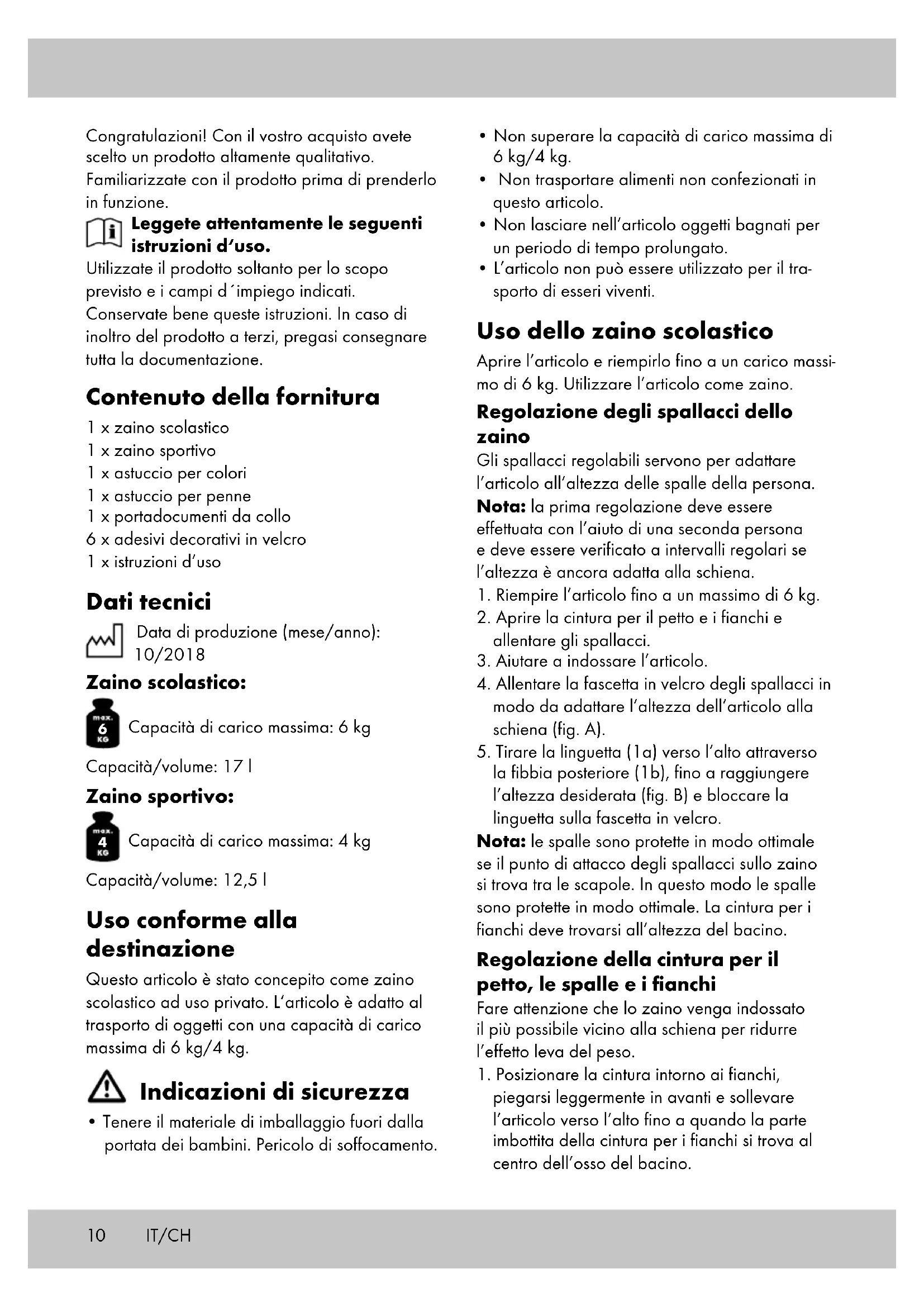 sportivo e dello zaino scolastico (fig. G). Conservazione, pulizia Conservare l‘articolo sempre asciutto e pulito in una stanza temperata senza batterie. Pulire solo con un panno asciutto. IMPORTANTE! Non pulire mai con prodotti detergenti aggressivi. Smaltimento Smaltire l‘articolo e i materiali dell‘imballaggio in conformità con le direttive locali in vigore. I materiali di imballaggio, come ad esempio le pellicole, non devono essere alla portata dei bambini. Conservare i materiali di imballaggio in un luogo non raggiungibile per i bambini. Smaltire i prodotti e gli imballaggi in modo ecologico. Il codice di riciclo viene utilizzato per identificare i vari materiali per il ritorno al ciclo del riutilizzo (recycling). Il codice è composto dal simbolo del riciclo, che dovrebbe rappresentare il ciclo del riutilizzo, e un numero che indica di che materiale si tratta. Avvertenze sulla garanzia e sulla gestione dei servizi di assistenza Questo prodotto è stato fabbricato con grande attenzione e sottoposto a costanti controlli. La garanzia è di tre anni dalla data d’acquisto. Conservi lo scontrino fiscale. La garanzia vale solo su difetti di materiale o di fabbricazione e decade in caso di uso errato o non conforme. Questa garanzia non costituisce una limitazione ai Suoi diritti legali e in partico- lare al diritto di garanzia. Per eventuali reclami vi preghiamo di contattare il seguente servizio hotline o mettervi in comunicazi- one con noi via e-mail.12 I nostri addetti all‘assistenza concorderanno con voi come procedere nel modo più rapido possibile. In qualsiasi caso vi consiglieremo per le vostre esigenze specifiche. Il periodo di garanzia non viene prolungato a seguito di riparazioni effettuate in garanzia, secondo il diritto di garanzia o per correntez- za commerciale. Lo stesso vale anche per le parti sostituite o riparate. Le riparazioni dopo la scadenza della garanzia verranno effettuate a pagamento. IAN: 309986 Assistenza Svizzera Tel.: 0842 665566 (0,08 CHF/Min., telefonia mobile max. 0,40 CHF/Min.) E-Mail: deltasport@lidl.ch IT/CH13 Congratulations! With your purchase you have decided on a high-quality product. Get to know the product before you start to use it. Carefully read the following instructions for use. Use the product only as described and only for the given areas of application. Keep these instructions safe. When passing the product on to a third party, always make sure that the documentation is included. SPackage contents 1 x school backpack 1 x sports backpack 1 x writing case 1 x pencil case 1 x neck pouch 6 x stickers 1 x instructions for use Technical data Date of manufacture (month/year): 10/2018 School backpack: