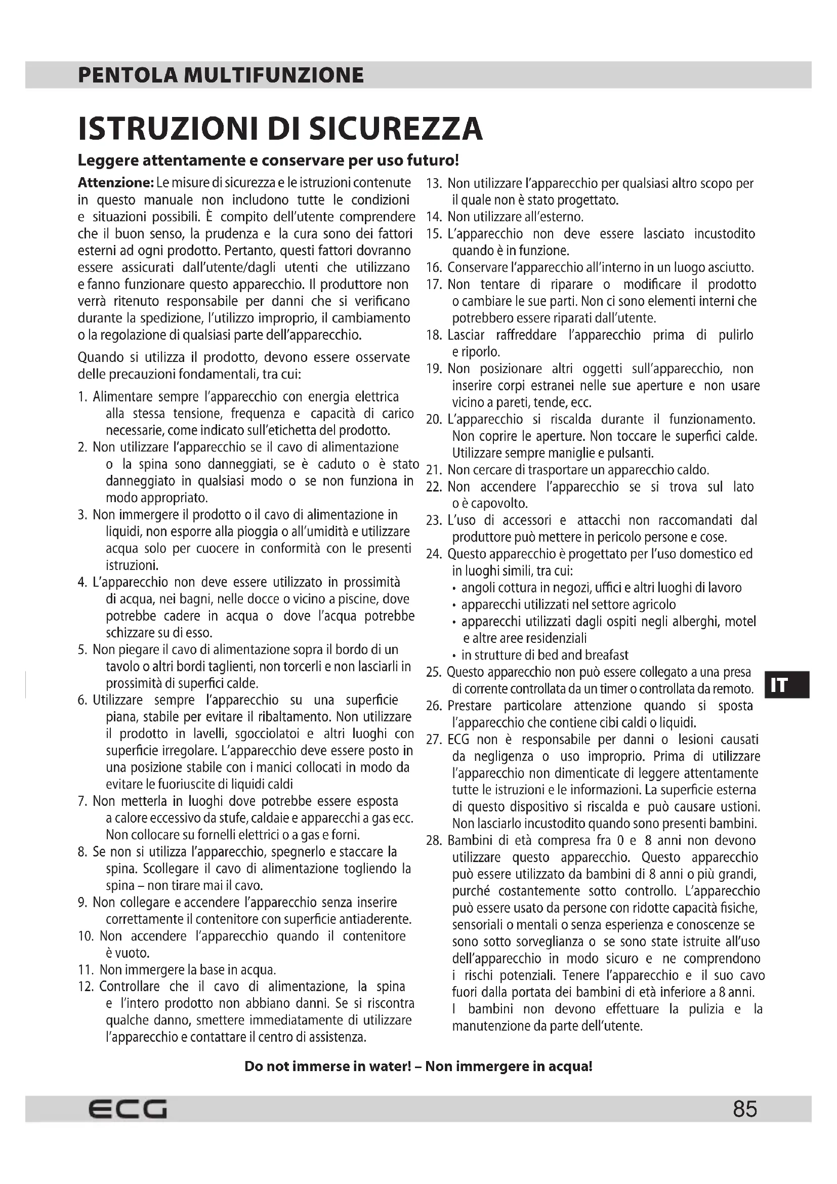utilizzare questo apparecchio. Questo apparecchio può essere utilizzato da bambini di 8 anni opiù grandi, purché costantemente sotto controllo. L’apparecchio può essere usato da persone con ridotte capacità fisiche, sensoriali omentali osenza esperienza econoscenze se sono sotto sorveglianza o se sono state istruite all’uso dell’apparecchio in modo sicuro e ne comprendono i rischi potenziali. Tenere l’apparecchio e il suo cavo fuori dalla portata dei bambini di età inferiore a8anni. I bambini non devono effettuare la pulizia e la manutenzione da parte dell’utente. Do not immerse in water! – Non immergere in acqua!IT