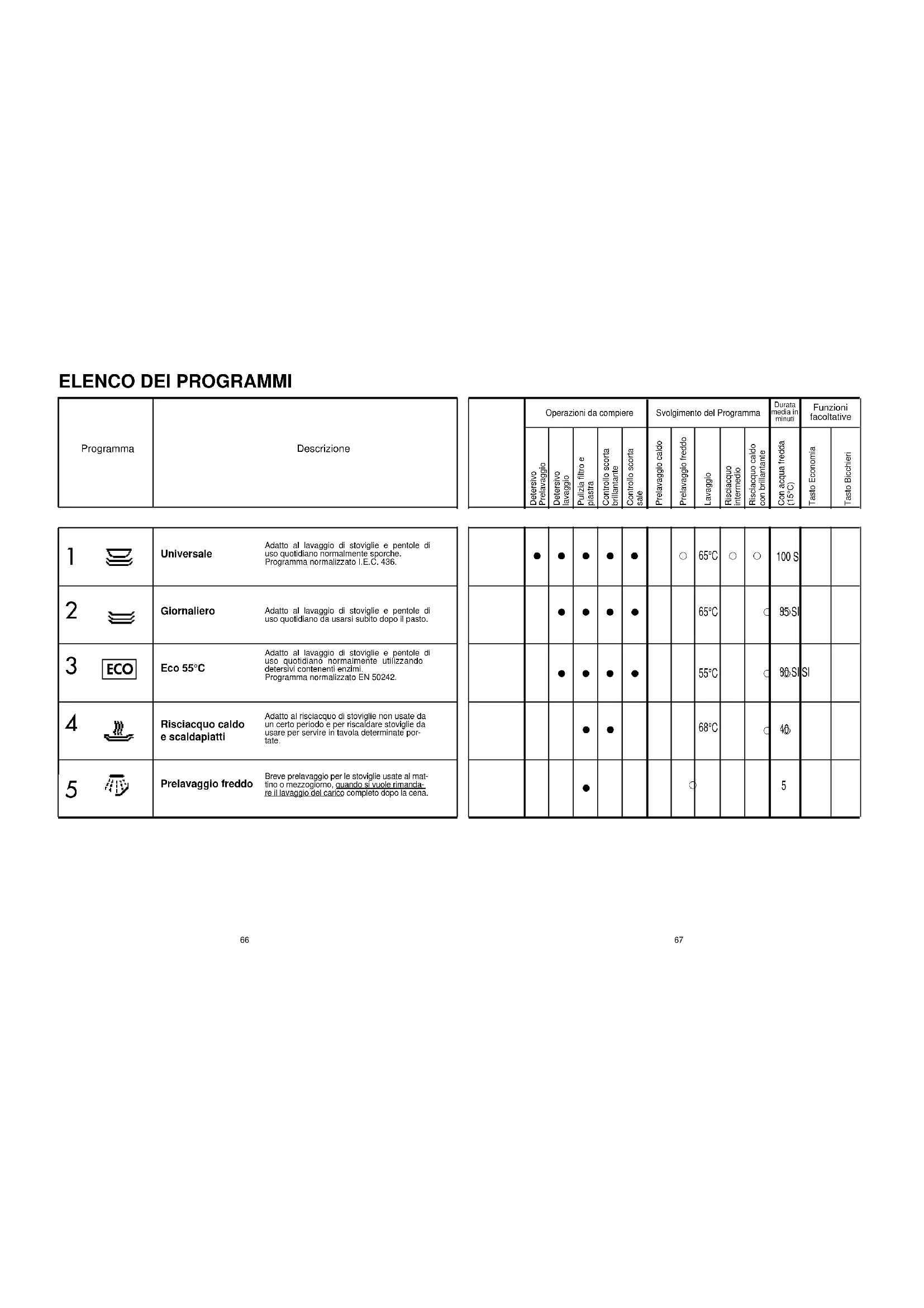 UniversaleGiornalieroEco 55°CRisciacquo caldo e scaldapiattiPrelavaggio freddoOperazioni da compiere Svolgimento del ProgrammaDuratamedia inminutiFunzioni facoltativeDetersivoPrelavaggioDetersivolavaggio Pulizia filtro e piastraControllo scorta brillantanteControllo scorta sale Prelavaggio caldoPrelavaggio freddoLavaggioRisciacquo intermedioRisciacquo caldocon brillantanteCon acqua fredda(15°C)Tasto EconomiaTasto Bicchieri ECO69 Prescrizioni di sicurezza La preghiamo di leggere attentamente le avvertenze contenute nel presente libretto in quanto forniscono importanti indicazioni riguardanti la sicurezza di installazione, d'uso, di manutenzione ed alcuni utili consigli per uti- lizzare al meglio la propria nuova lavastoviglie. Conservi con cura questo libretto per ogni ulteriore consultazione. L'uso di un qualsiasi apparecchio elettrico comporta l'osservanza di alcune regole fonda- mentali. In particolare: – non toccare l'apparecchio con mani o piedi bagnati o umidi – non usare l'apparecchio a piedi nudi – non tirare il cavo di alimentazione, o l'appa- recchio stesso, per staccare la spina dalla presa di corrente – non esporre l'apparecchio ad agenti atmo- sferici (pioggia, sole, ecc.). – non permettere che l'apparecchio sia usato dai bambini senza sorveglianza – In caso di incompatibilità tra la presa e la spina dell'apparecchio, fare sostituire la presa con altra di tipo adatto da personale qualificato. Quest'ultimo, in particolare, dovrà anche accertare che la sezione dei cavi della presa sia idonea alla potenza assorbita dall'apparecchio. Attenzione Questa lavastoviglie è dotata di un dispositivo di sicurezza anti alla- gamento, funzionante anche in assenza di energia elettrica, che blocca auto- maticamente l'afflusso dell'acqua nel caso che questa superi il normale livello a causa di un eventuale malfunzionamento. Importante Per evitare l'intervento intempestivo del dispo- sitivo di sicurezza antitrabocco, si raccomanda di non muovere o inclinare la lavastoviglie durante il funzionamento. Nel caso sia necessario muovere o inclinare la lavastoviglie, assicurarsi prima che abbia completato il ciclo di lavaggio e che non ci sia acqua nella vasca. Scelta del programma e funzioni particolari Per impostare il programma, ruotare la mano- pola in senso orario fino a far coincidere l’indi- ce con il simbolo del programma scelto, quindi premere il tasto (Avvio/Arresto). Accertarsi che il rubinetto dell’acqua sia aper- to, che la porta sia ben chiusa. Tasto Economia Il tasto « » riduce il riscal- damento finale dell’acqua duran- te l’ultimo risciacquo. Si attiva così una asciugatura naturale come nei nor- mali scolapiatti, semplicemente socchiudendo la porta a fine ciclo per favorire la circolazione naturale dell’aria Il tasto consente un risparmio di energia di oltre il 20% e abbrevia il ciclo. Consigliato per il lavaggio serale, quando non si desidera riavere subito, perfettamente asciutte, le stovi- glie appena lavate. Tasto bicchieri Premendo questo tasto con il pro- gramma N° 3, la lavastoviglie esegue il ciclo delicato a 45°C rendendolo così particolarmente adatto per bicchieri deli- cati. Il ciclo è terminato Quando la manopola programmi raggiunge il simbolo 0 il ciclo è terminato. Premere il tasto per togliere tensione alla lavastoviglie e solo successivamente aprire lo sportello.