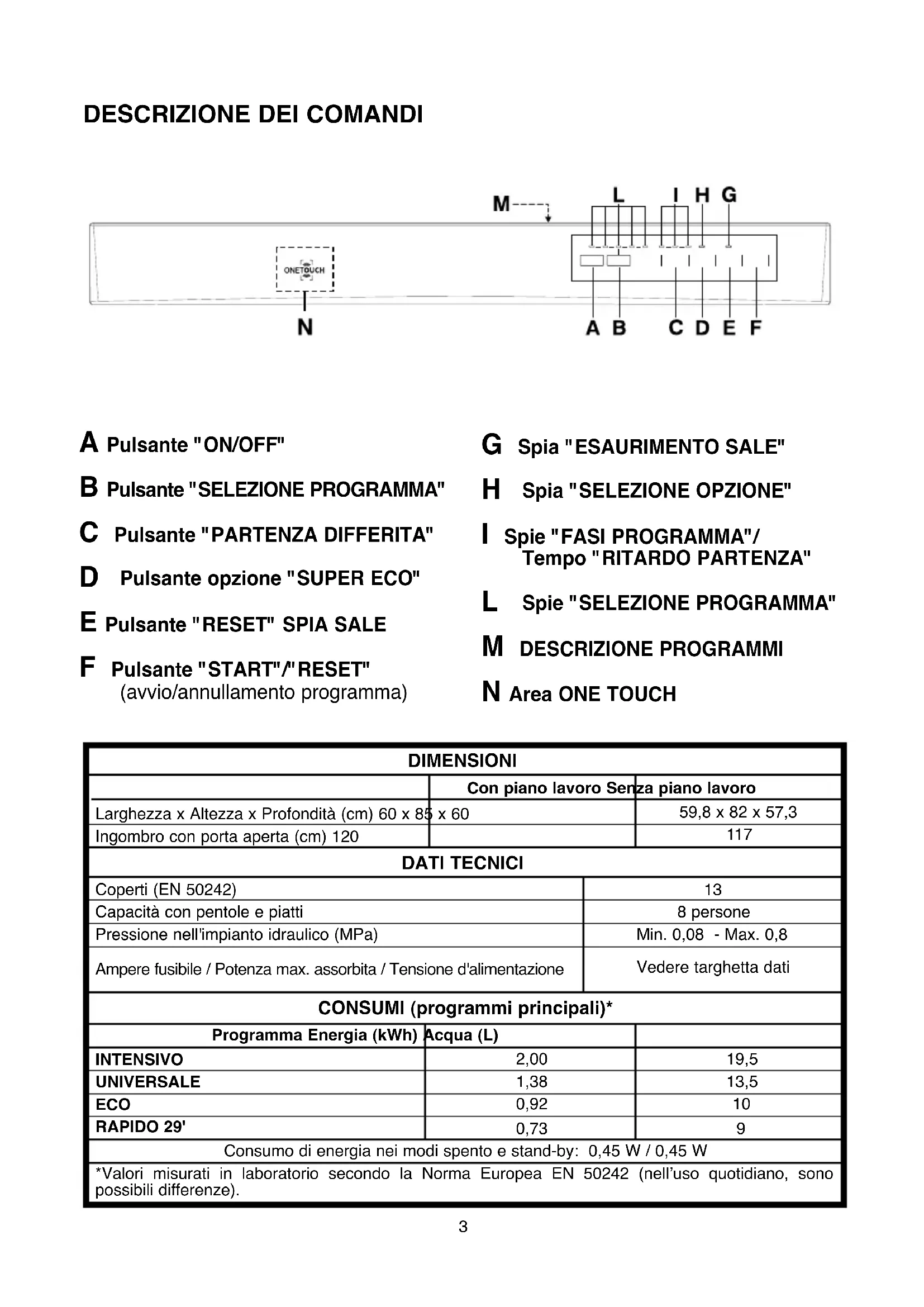 8 persone Min. 0,08 - Max. 0,8 Vedere targhetta dati Consumo di energia nei modi spento e stand-by: 0,45 W / 0,45 W *Valori misurati in laboratorio secondo la Norma Europea EN 50242 (nell’uso quotidiano, sono possibili differenze). 59,8 x 82 x 57,3