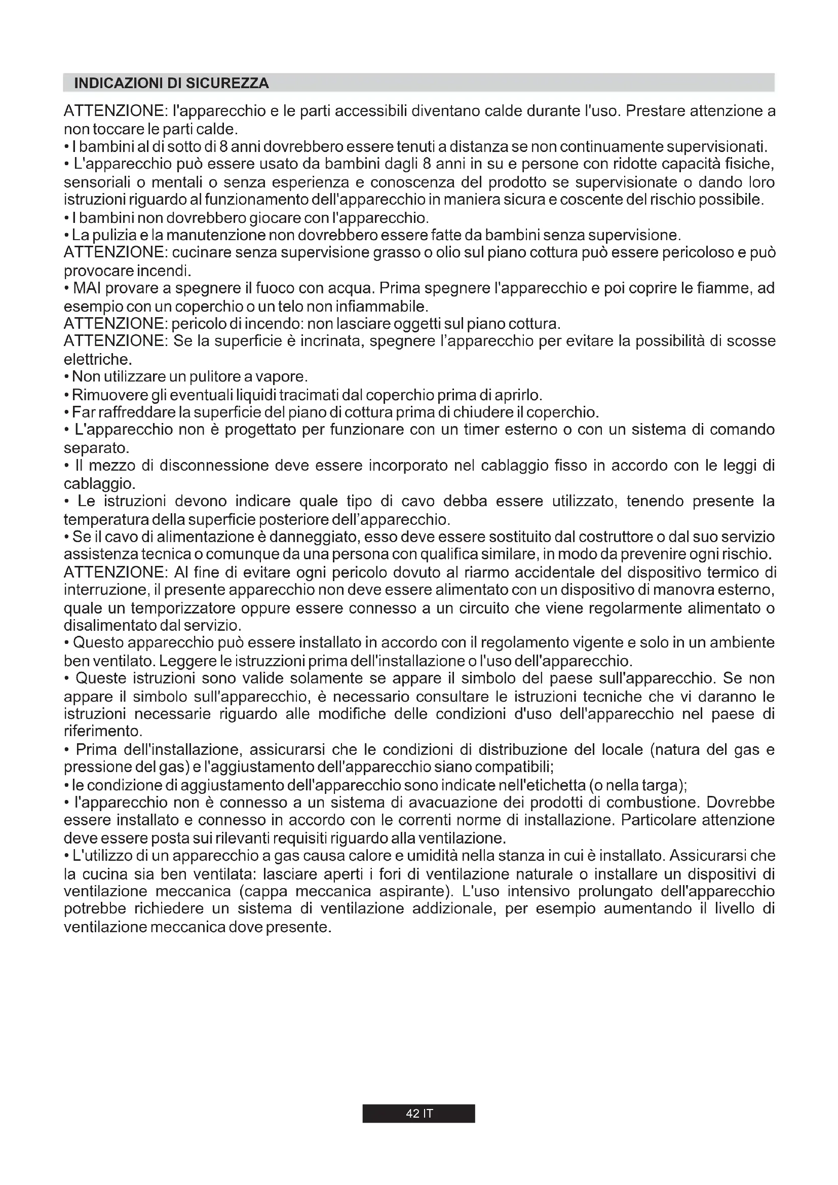 - MAI provare a spegnere il fuoco con acqua. Prima spegnere l'apparecchio e poi coprire le fiamme, ad esempio con un coperchio o un telo non infiammabile. ATTENZIONE: pericolo di incendo: non lasciare oggetti sul piano cottura. ATTENZIONE: Se la superficie è incrinata, spegnere l’apparecchio per evitare la possibilità di scosse elettriche.