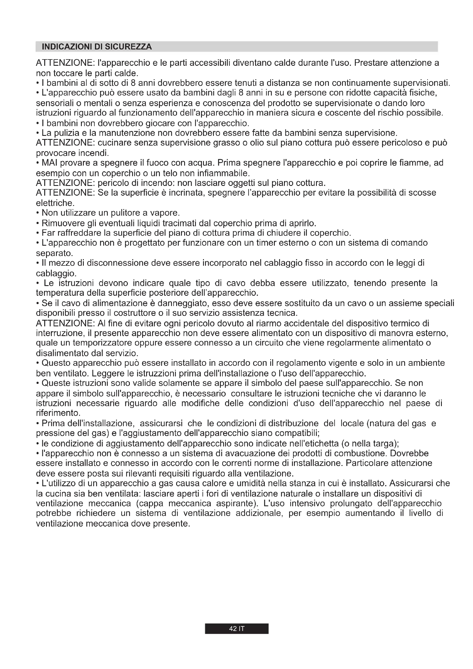 - MAI provare a spegnere il fuoco con acqua. Prima spegnere l'apparecchio e poi coprire le fiamme, ad esempio con un coperchio o un telo non infiammabile. ATTENZIONE: pericolo di incendo: non lasciare oggetti sul piano cottura. ATTENZIONE: Se la superficie è incrinata, spegnere l’apparecchio per evitare la possibilità di scosse elettriche.