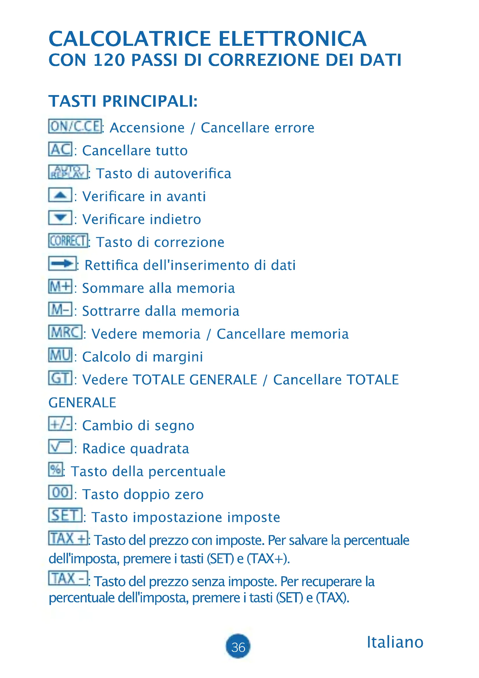 TASTI PRINCIPALI: : Accensione / Cancellare errore : Cancellare tutto : Tasto di autoverica : Vericare in avanti : Vericare indietro : Tasto di correzione : Rettica dell'inserimento di dati : Sommare alla memoria : Sottrarre dalla memoria : Vedere memoria / Cancellare memoria : Calcolo di margini : Vedere TOTALE GENERALE / Cancellare TOTALE GENERALE : Cambio di segno : Radice quadrata : Tasto della percentuale : Tasto doppio zero : Tasto impostazione imposte : Tasto del prezzo con imposte. Per salvare la percentuale dell'imposta, premere i tasti (SET) e (TAX+). : Tasto del prezzo senza imposte. Per recuperare la percentuale dell'imposta, premere i tasti (SET) e (TAX).37 DESCRIZIONE DEI SETTORI:
