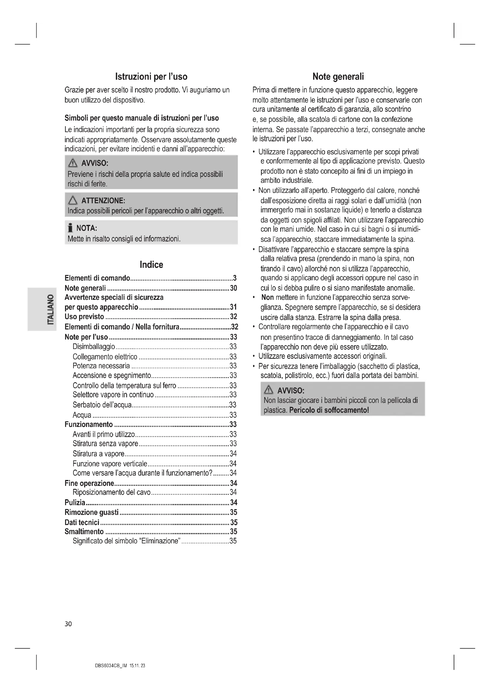 - Per sicurezza tenere l’imballaggio (sacchetto di plastica, scatola, polistirolo, ecc.) fuori dalla portata dei bambini. AVVISO: Non lasciar giocare i bambini piccoli con la pellicola di plastica. Pericolo di soffocamento!DBS6034CB_IM 15.11. 23
