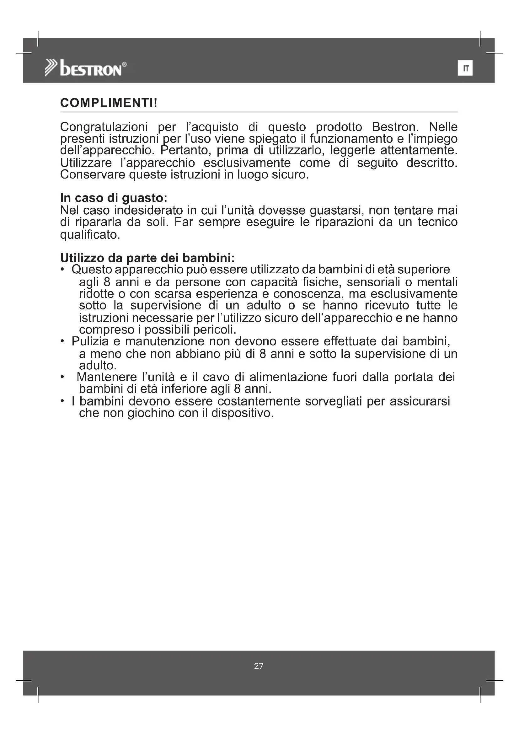 ENCOMPLIMENTI! Congratulazioni per l’acquisto di questo prodotto Bestron. Nelle presenti istruzioni per l’uso viene spiegato il funzionamento e l’impiego dell’apparecchio. Pertanto, prima di utilizzarlo, leggerle attentamente. Utilizzare l’apparecchio esclusivamente come di seguito descritto. Conservare queste istruzioni in luogo sicuro. In caso di guasto: Nel caso indesiderato in cui l’unità dovesse guastarsi, non tentare mai di ripararla da soli. Far sempre eseguire le riparazioni da un tecnico qualificato. Utilizzo da parte dei bambini: