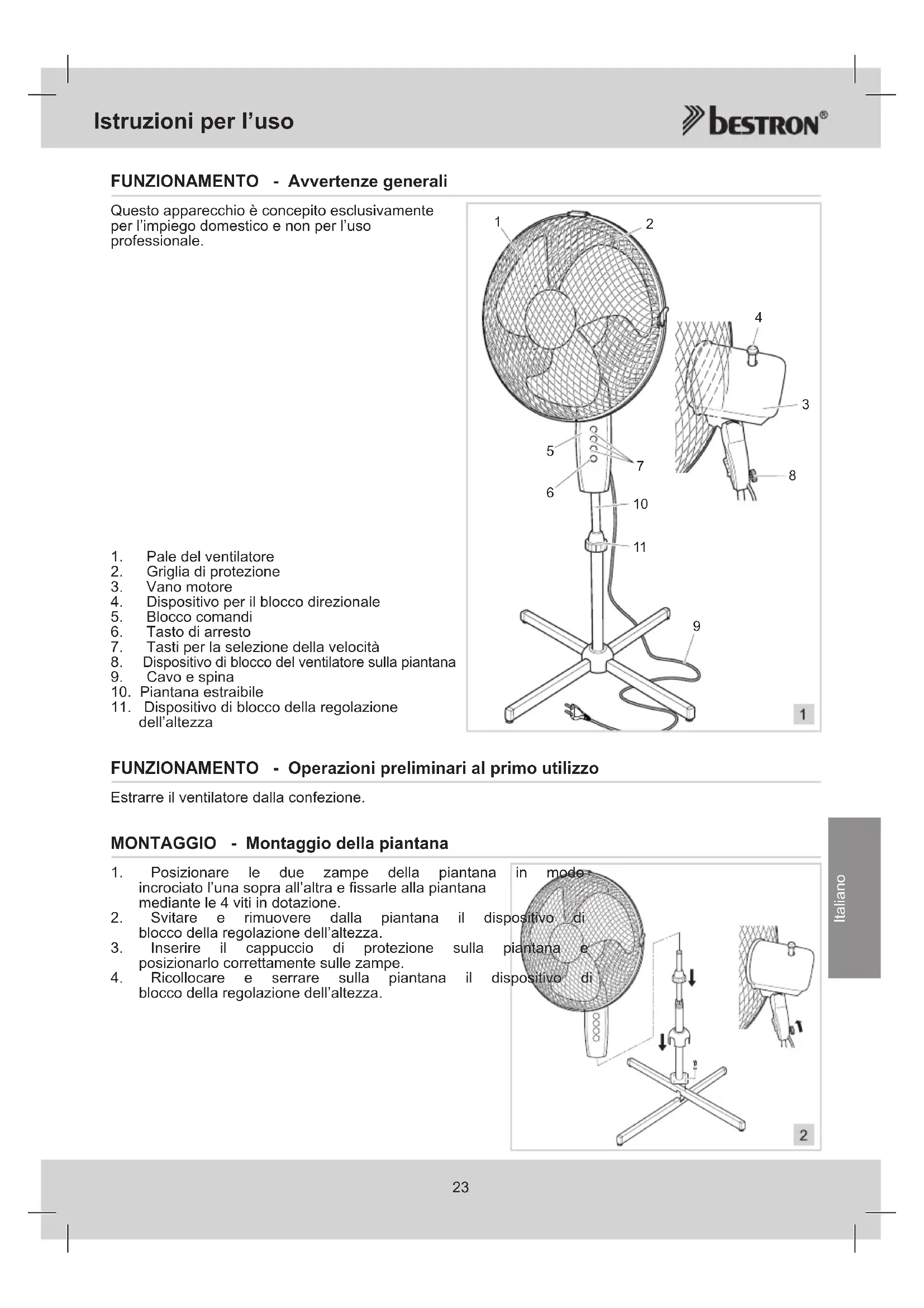 10.Piantanaestraibile 11.Dispositivodibloccodellaregolazione dell’altezza FUNZIONAMENTO - Operazioni preliminari al primo utilizzo Estrarreilventilatoredallaconfezione. MONTAGGIO - Montaggio della piantana