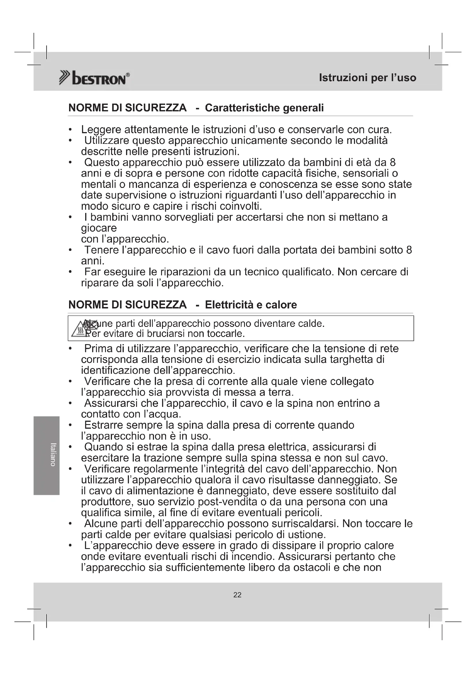 - Far eseguire le riparazioni da un tecnico qualificato. Non cercare di riparare da soli l’apparecchio. NORME DI SICUREZZA - Elettricità e calore Alcune parti dell’apparecchio possono diventare calde. Per evitare di bruciarsi non toccarle.