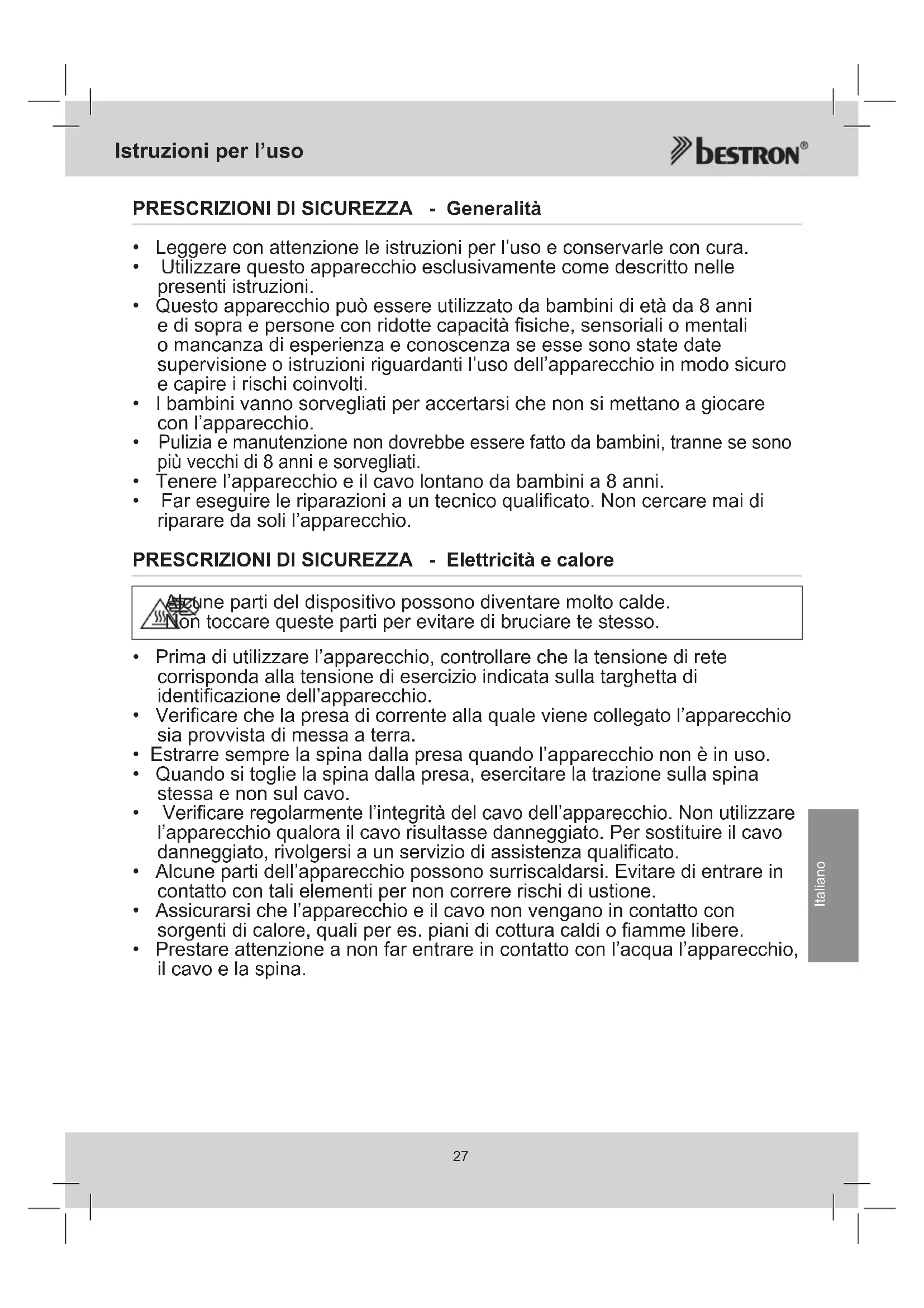 - Far eseguire le riparazioni a un tecnico qualificato. Non cercare mai di riparare da soli l’apparecchio. PRESCRIZIONI DI SICUREZZA - Elettricità e calore