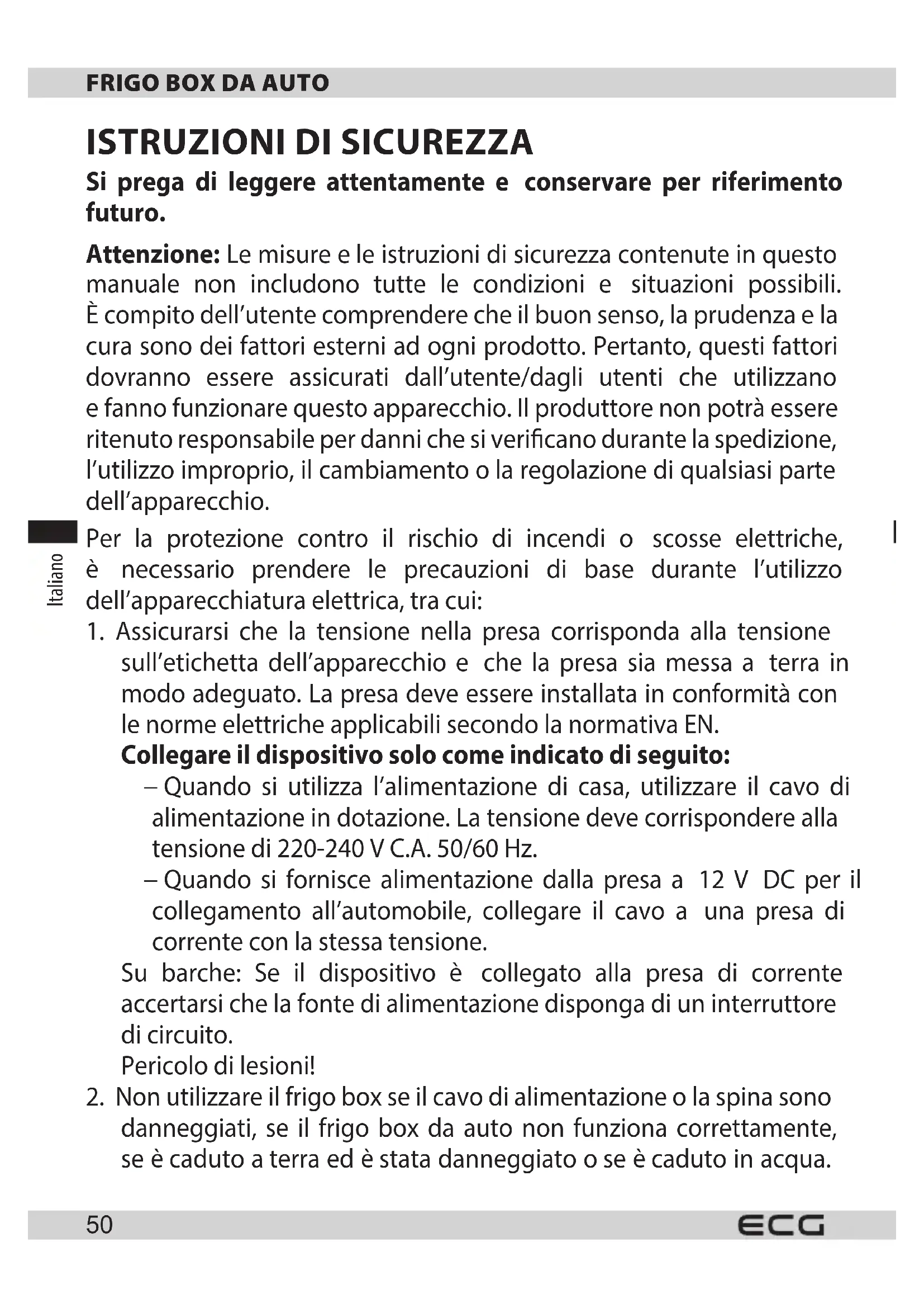 riportate in questo manuale. Questo frigo box da auto è stato progettato per uso esclusivamente domestico. Il produttore non può essere ritenuto responsabile per danni causati da un uso improprio di questo apparecchio.
