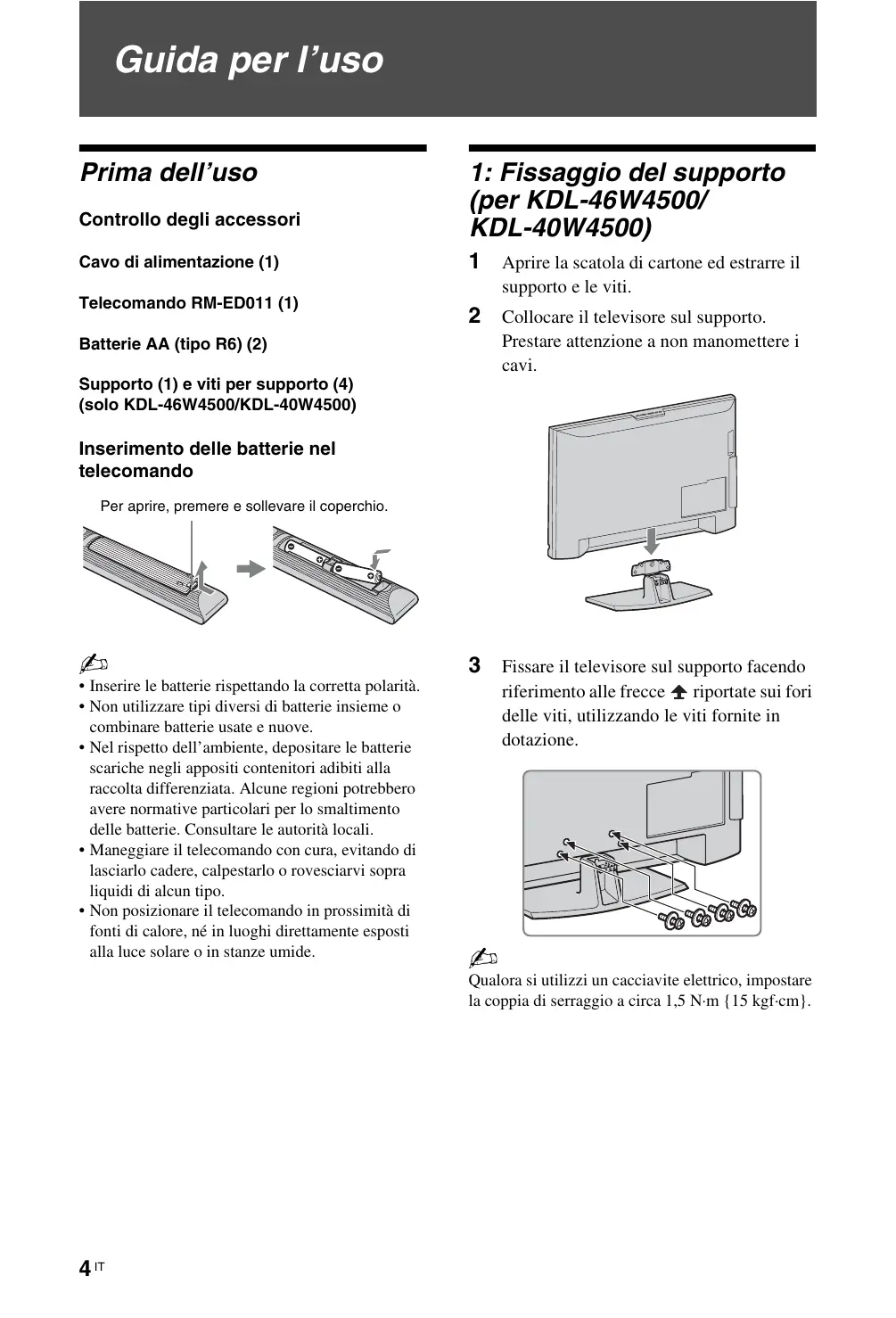 Guida per l’uso Prima dell’uso Controllo degli accessori Cavo di alimentazione (1) Telecomando RM-ED011 (1) 1: Fissaggio del supporto (per KDL-46W4500/ KDL-40W4500) 1 Aprire la scatola di cartone ed estrarre il supporto e le viti. 2 Collocare il televisore sul supporto. Prestare attenzione a non manomettere i cavi. Batterie AA (tipo R6) (2) Supporto (1) e viti per supporto (4) (solo KDL-46W4500/KDL-40W4500) Inserimento delle batterie nel telecomando Per aprire, premere e sollevare il coperchio.