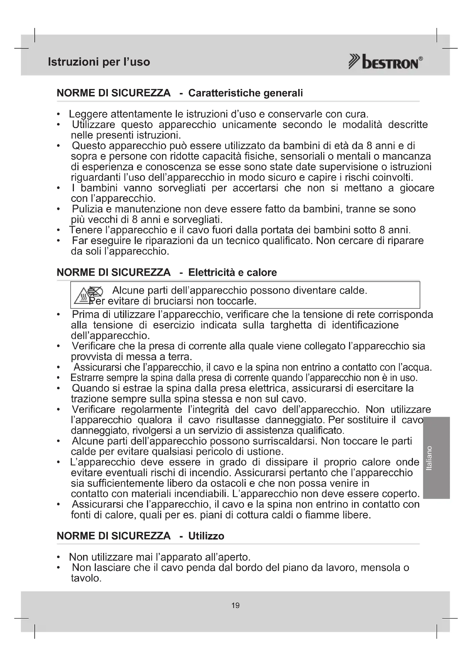 - Far eseguire le riparazioni da un tecnico qualificato. Non cercare di riparare da soli l’apparecchio. NORME DI SICUREZZA - Elettricità e calore