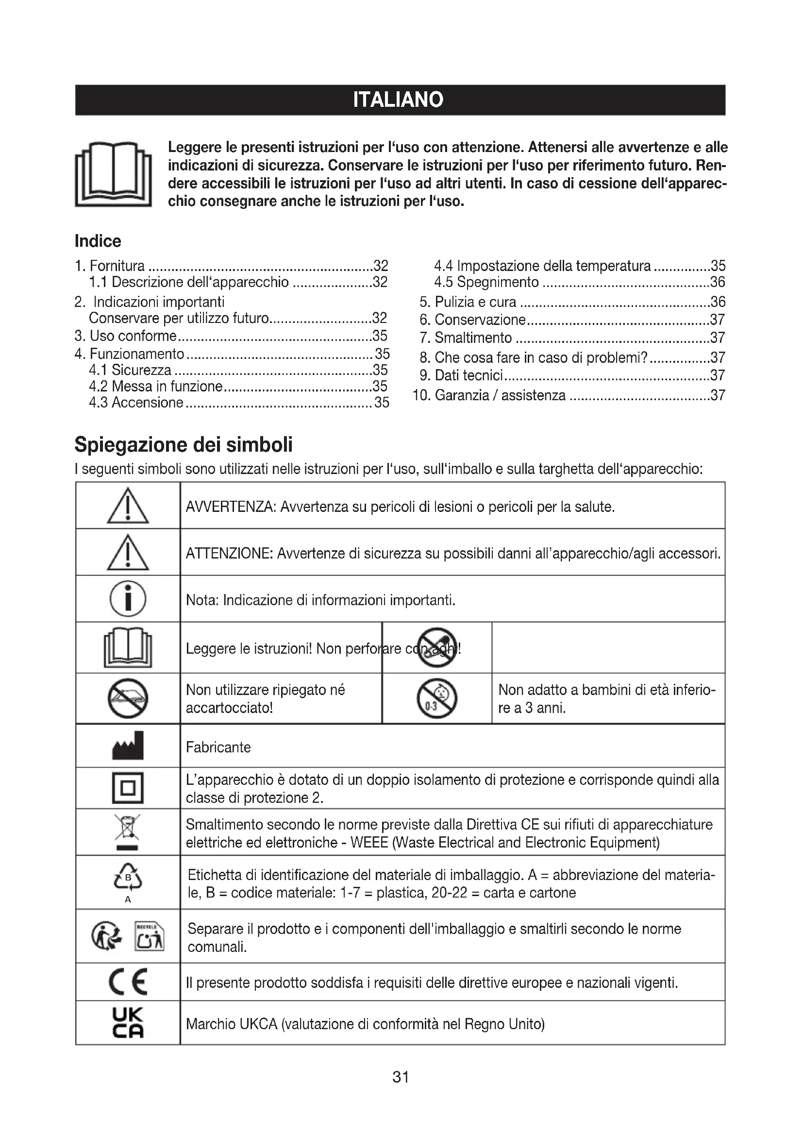 Etichetta di identificazione del materiale di imballaggio. A = abbreviazione del materia- le, B = codice materiale: 1-7 = plastica, 20-22 = carta e cartone Separare il prodotto e i componenti dell'imballaggio e smaltirli secondo le norme comunali. Il presente prodotto soddisfa i requisiti delle direttive europee e nazionali vigenti. Marchio UKCA (valutazione di conformità nel Regno Unito) ITALIANO Indice