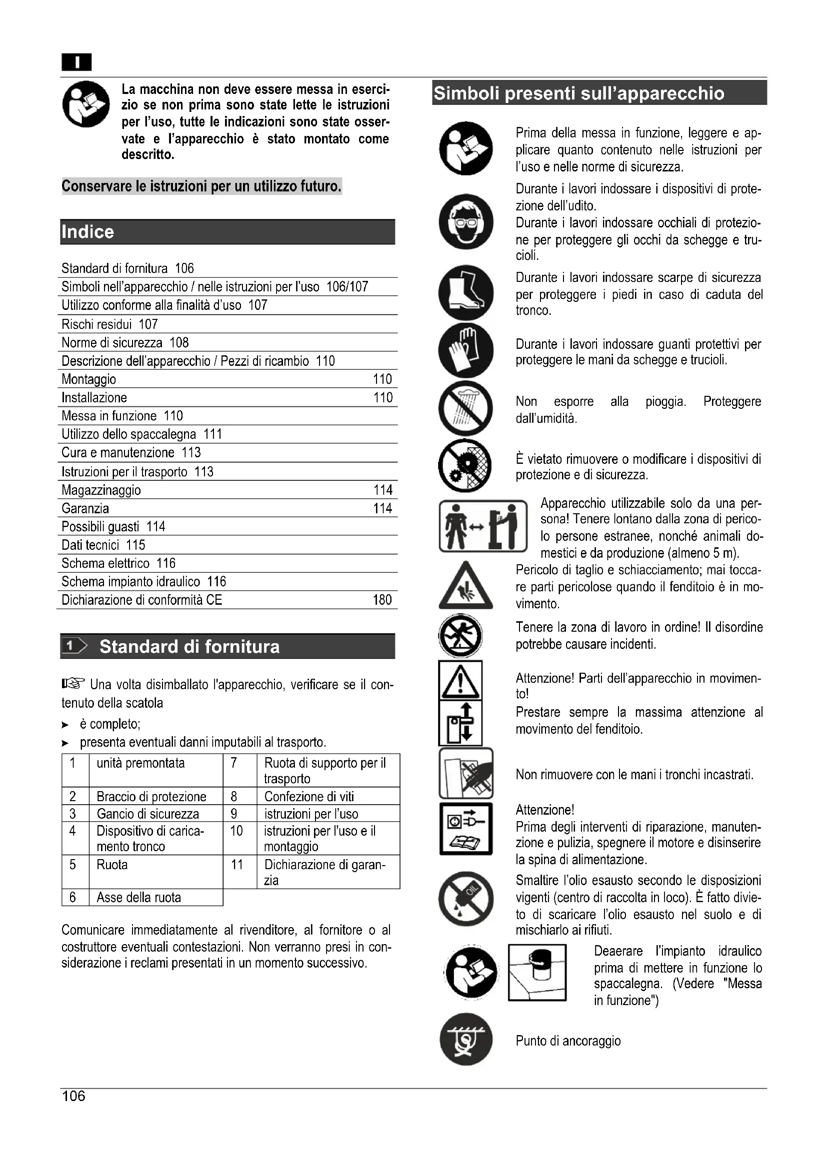 Indice Standard di fornitura 106 Simboli nell’apparecchio / nelle istruzioni per l’uso 106/107 Utilizzo conforme alla finalità d’uso 107 Rischi residui 107 Norme di sicurezza 108 Descrizione dell’apparecchio / Pezzi di ricambio 110 Montaggio 110 Installazione 110 Messa in funzione 110 Utilizzo dello spaccalegna 111 Cura e manutenzione 113 Istruzioni per il trasporto 113 Magazzinaggio 114 Garanzia 114 Possibili guasti 114 Dati tecnici 115 Schema elettrico 116 Schema impianto idraulico 116 Dichiarazione di conformità CE 180