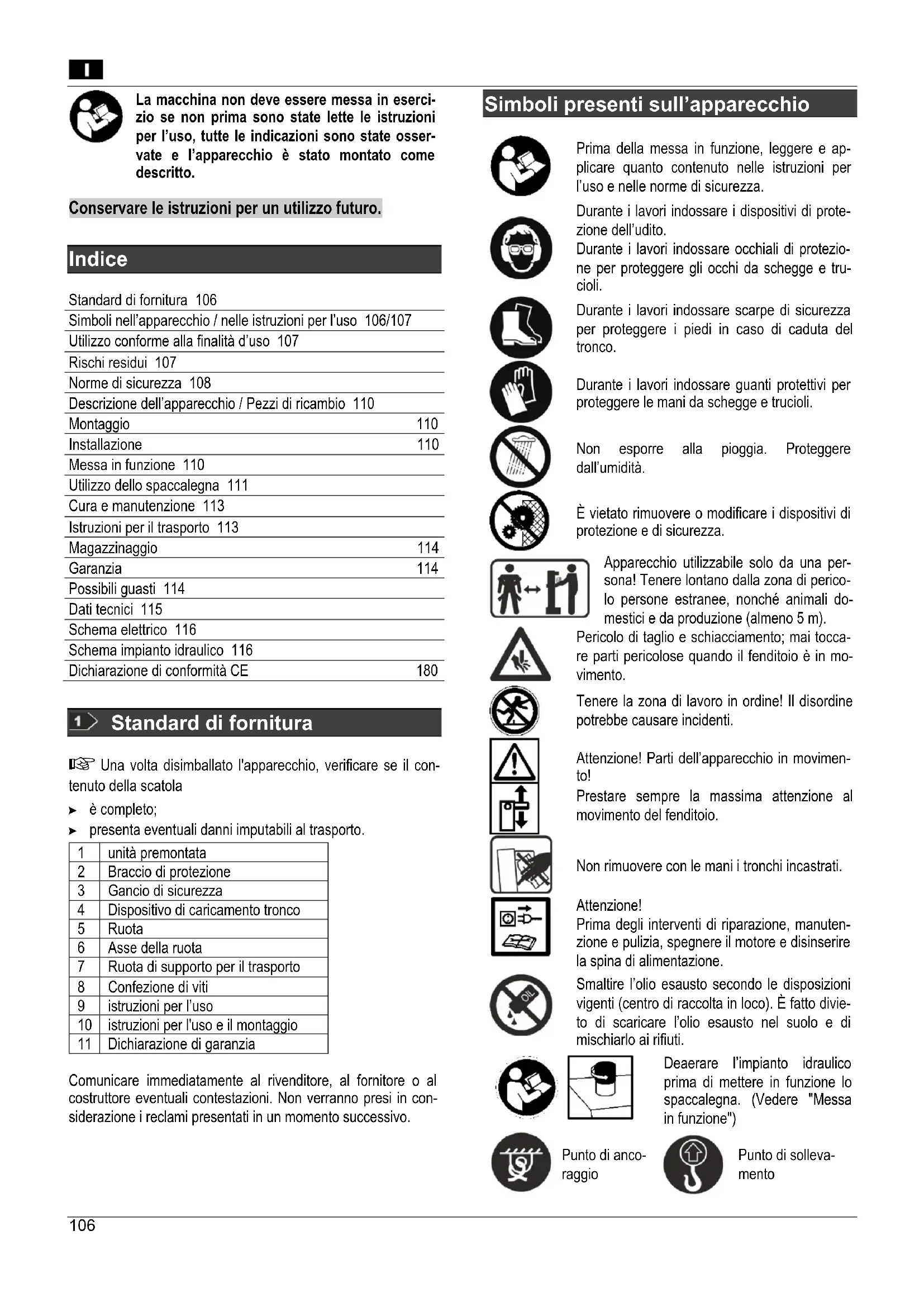 Indice Standard di fornitura 106 Simboli nell’apparecchio / nelle istruzioni per l’uso 106/107 Utilizzo conforme alla finalità d’uso 107 Rischi residui 107 Norme di sicurezza 108 Descrizione dell’apparecchio / Pezzi di ricambio 110 Montaggio 110 Installazione 110 Messa in funzione 110 Utilizzo dello spaccalegna 111 Cura e manutenzione 113 Istruzioni per il trasporto 113 Magazzinaggio 114 Garanzia 114 Possibili guasti 114 Dati tecnici 115 Schema elettrico 116 Schema impianto idraulico 116 Dichiarazione di conformità CE 180
