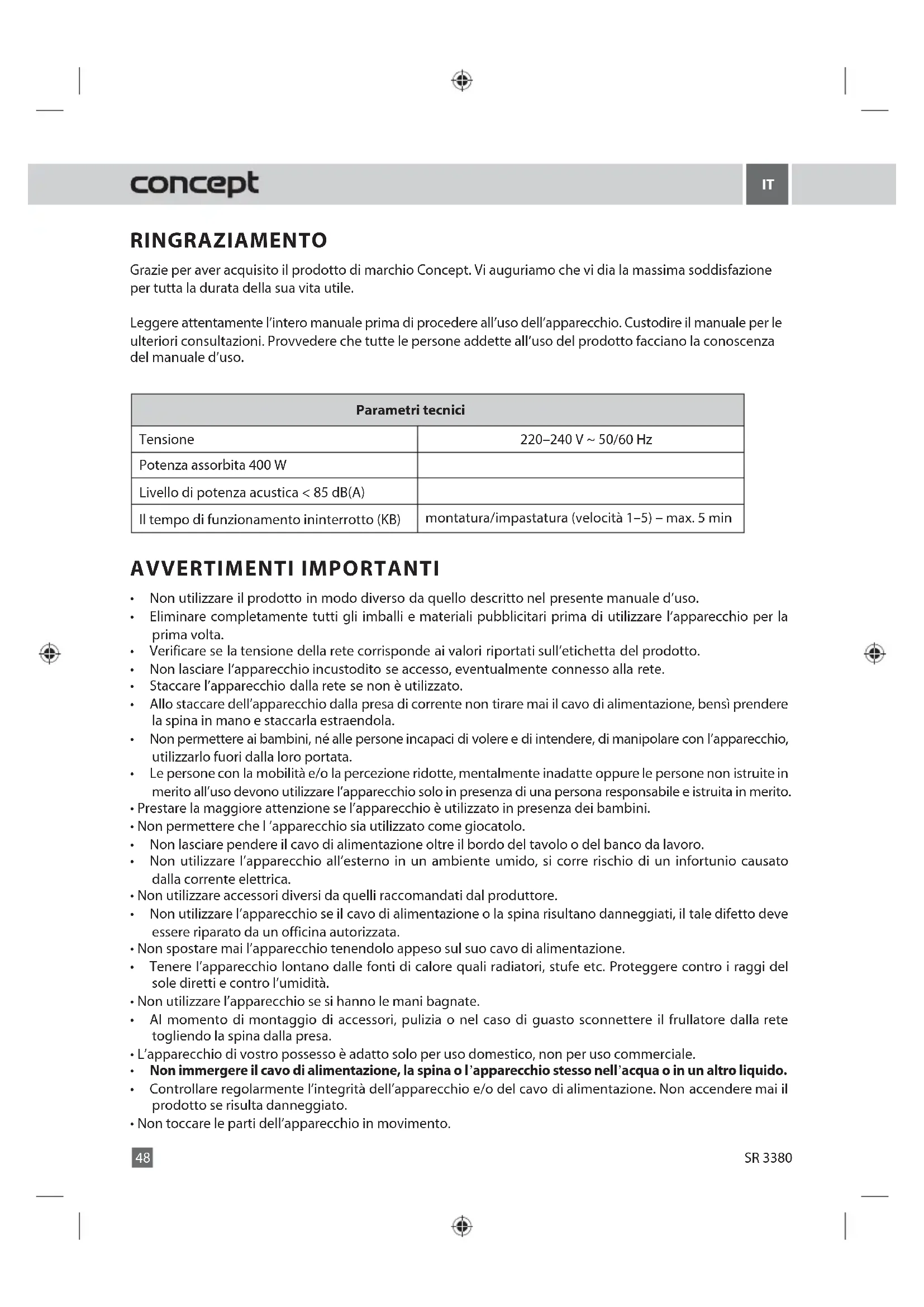 Riciclaggio del prodotto alla fine della sua vita utile Il simbolo riportato sul prodotto o sul suo imballo indica che il prodotto stesso non deve essere smaltito come rifiuto urbano. Va portato in un centro di raccolta dei rifiuti elettrici ed elettronici. Provvedendo allo smaltimento corretto del prodotto si può prevenire l’impatto negativo sull’ ambiente e/o sulla salute umana nel caso di mancato riciclaggio. Le maggiori informazioni sulle modalità dello smaltimento del prodotto sono reperibili presso l’ufficio locale di amministrazione pubblica oppure nel negozio dove il prodotto è stato acquisito. Il presente prodotto rispetta tutti i requisiti previsti dalle normative UE. Il produttore si riserva il diritto di modificare senza preavviso il testo del manuale d’uso, il design del prodotto e/o i suoi parametri tecnici. Problema Causa Soluzione51SR 3380AGRADECIMIENTO Gracias por comprar este producto de la marca Concept y esperamos que quede satisfecho con él durante todo el tiempo que lo use. Antes de usar el producto, lea con cuidado todo el manual y luego guárdelo. Asegúrese de que las demás personas que vayan a utilizar el producto se familiaricen con el presente manual. Parámetros técnicos Tensión 220–240 V ~ 50 /60 Hz Potencia de entrada 400 W Nivel de ruido < 85 dB(A) Operación ininterrumpida batir/amasar (vel. 1–5) – max. 5 min ADVERTENCIAS IMPORTANTES