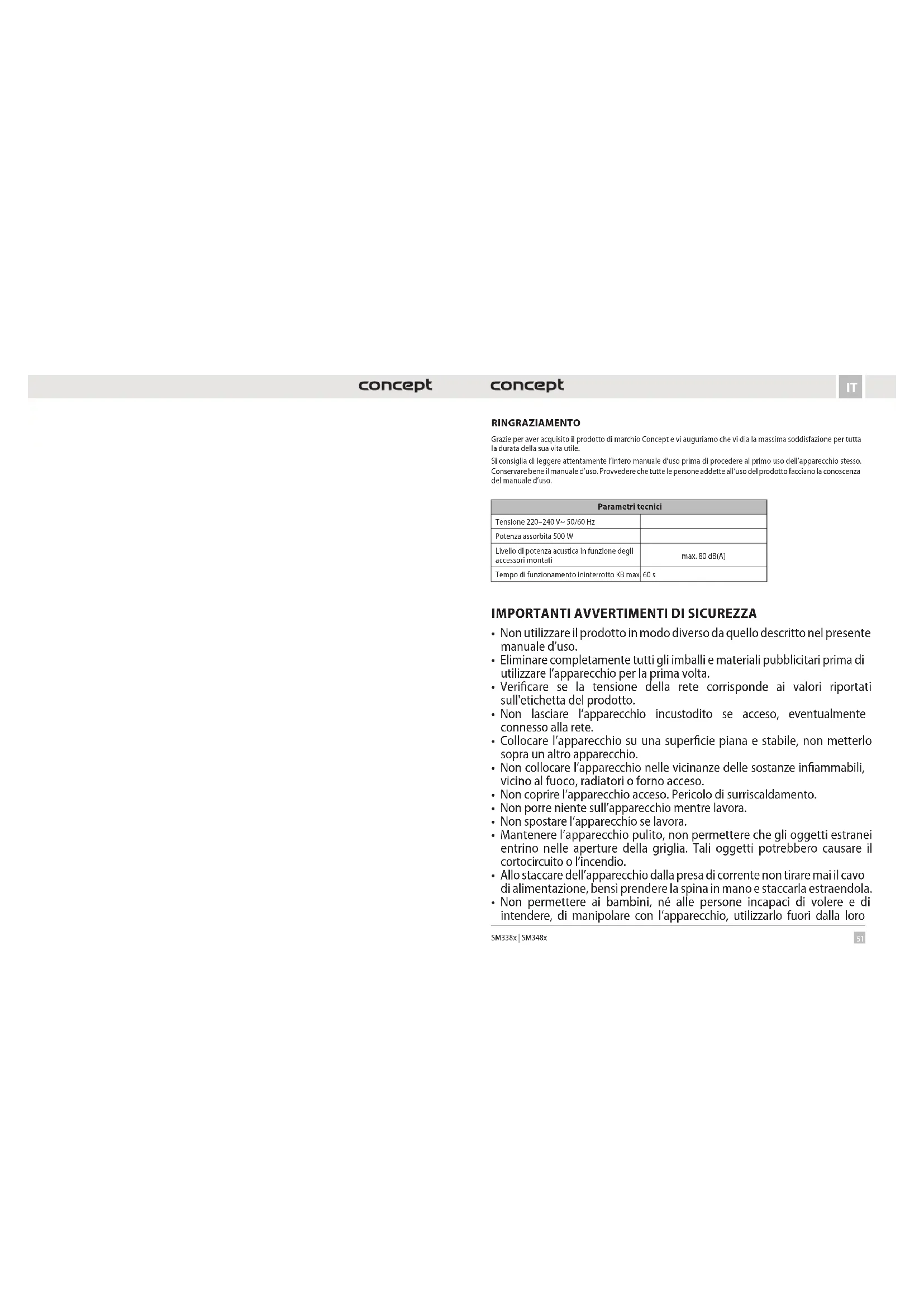 SM338x | SM348x RINGRAZIAMENTO Grazie per aver acquisito il prodotto di marchio Concept e vi auguriamo che vi dia la massima soddisfazione per tutta la durata della sua vita utile. Si consiglia di leggere attentamente l’intero manuale d’uso prima di procedere al primo uso dell’apparecchio stesso. Conservare bene il manuale d’uso. Provvedere che tutte le persone addette all’uso del prodotto facciano la conoscenza del manuale d’uso. Parametri tecnici Tensione 220–240 V~ 50/60 Hz Potenza assorbita 500 W Livello di potenza acustica in funzione degli accessori montati max. 80 dB(A) Tempo di funzionamento ininterrotto KB max. 60 s