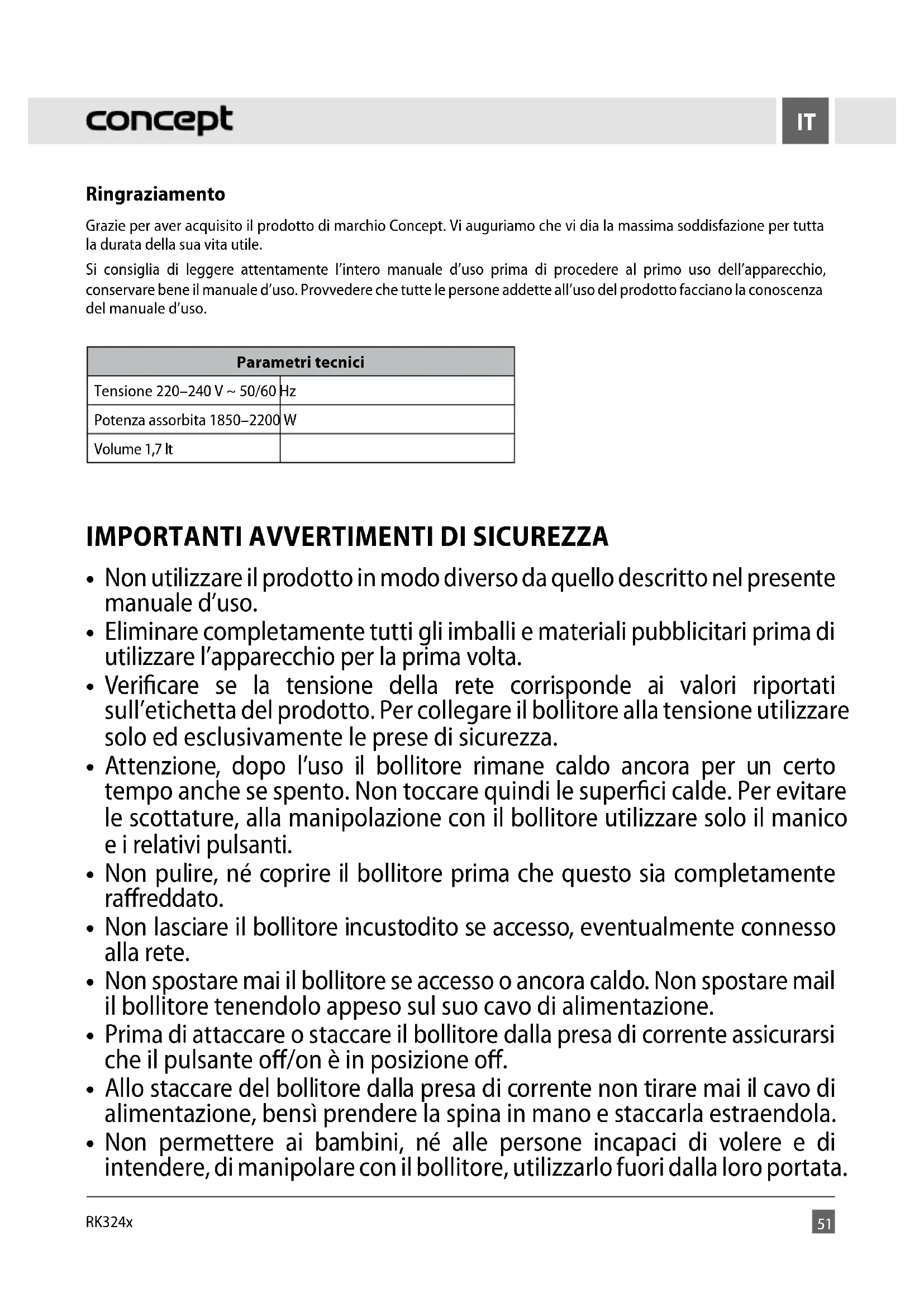 AVVERTIMENTI: Prima di utilizzare il bollitore per un uso concreto si suggerisce di caricarlo d’acqua di riscaldarla e di buttarla. Tale operazione è da ripetere 3 volte. Solo dopo il bollitore è pronto per l’uso. Il bollitore può essere utilizzato solo ed esclusivamente con la sua sede originale.55 RK324x