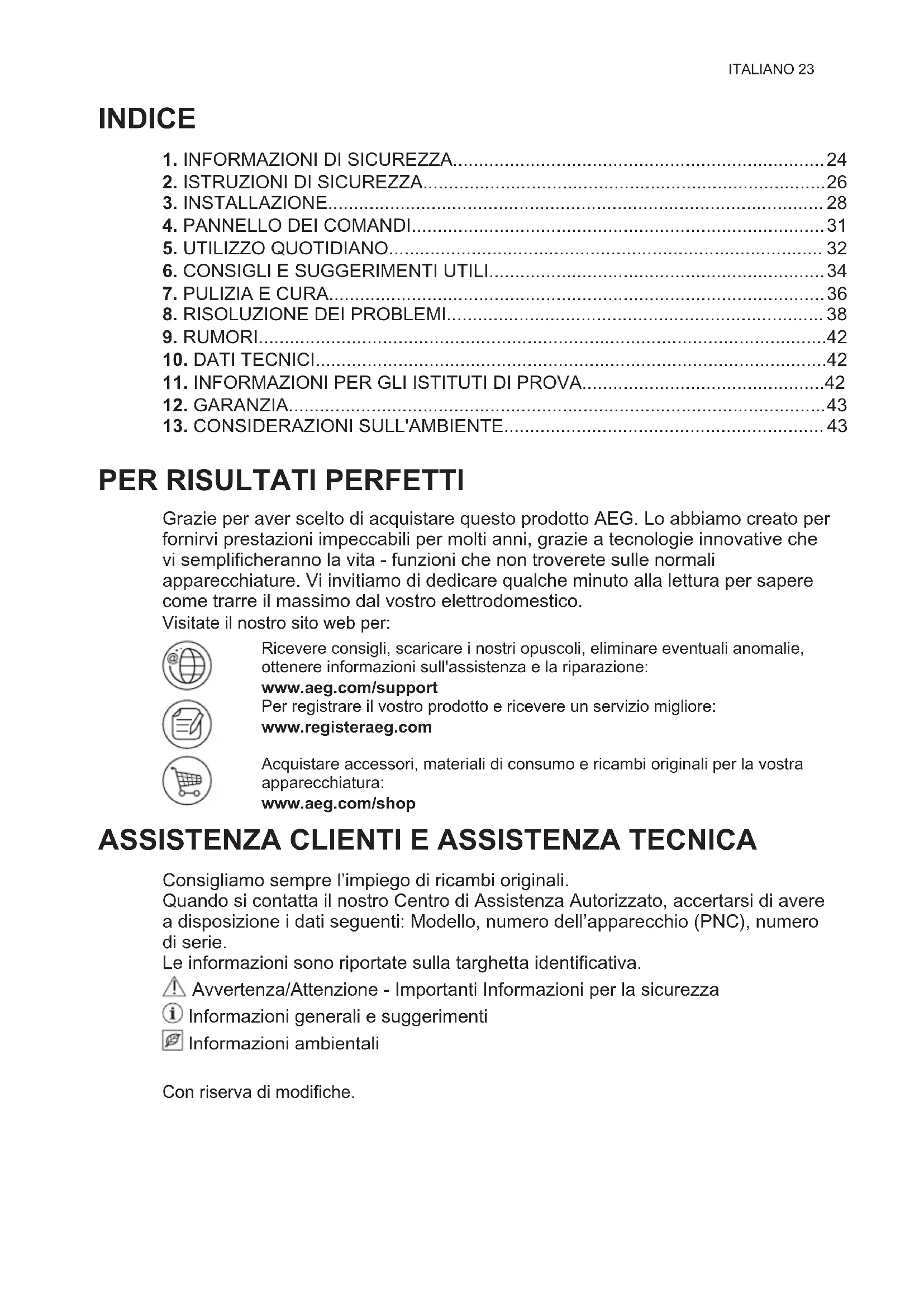 Consigliamo sempre l’impiego di ricambi originali. Quando si contatta il nostro Centro di Assistenza Autorizzato, accertarsi di avere a disposizione i dati seguenti: Modello, numero dell’apparecchio (PNC), numero di serie. Le informazioni sono riportate sulla targhetta identificativa. Avvertenza/Attenzione - Importanti Informazioni per la sicurezza Informazioni generali e suggerimenti Informazioni ambientali Con riserva di modifiche.