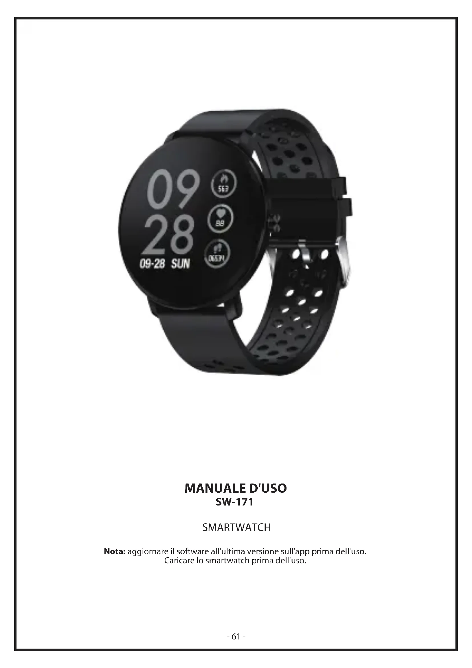 Omega 5A, Soeften DK-8382 Hinnerup Dinamarca www.facebook.com/denverelectronics - 60 -- 61 - MANUALE D'USO SW-171 SMARTWATCH Nota: aggiornare il software all'ultima versione sull'app prima dell'uso. Caricare lo smartwatch prima dell'uso.Scarica l'app Scansionare il seguente codice QR, scaricare e installare l'app. Scansionare il codice QR e scaricare Abbinamento Aprire l'app e impostare il prolo. Andare a [Device], fare clic su [Add a Device]. Scegliere il dispositivo nell'elenco di scansione. Finisci Premere a lungo la [time page] sul dispositivo e andare alla pagina dei dettagli. L'indirizzo MAC nella pagina dei dettagli può aiutare a identicare il dispositivo nell'elenco di scansione. Funzionalità dello smartwatch Traccia sportiva Lo smartwatch misura automaticamente i passi eettuati, le calorie bruciate e la distanza percorsa. I dati misurati sono sincronizzati con l'app. Nota: i dati sportivi memorizzati sull'orologio vengono cancellati quotidianamente a mezzanotte. Monitoraggio riposo Se si utilizza lo smartwatch durante il riposo, misurerà il tempo e a qualità del riposo. I dati misurati sono sincronizzati con l'app. Nota: i dati relativi al riposo memorizzati sull'orologio vengono cancellati alle 20:00 il giorno successivo. Monitoraggio frequenza cardiaca Toccare la pagina della frequenza cardiaca per iniziare a misurarne il valore. Nella pagina è possibile visualizzare i dati relativi alla frequenza cardiaca delle ultime 7 misurazioni. - 62 -Allenamento multi-sport Toccare la pagina di allenamento per iniziare una nuova registrazione della misurazione dell'allenamento. Sono disponibili 8 modalità sportive. Gli ultimi dati di allenamento vengono visualizzati nella pagina di allenamento. Monitoraggio della pressione del sangue Toccare la pagina della pressione del sangue per iniziare a misurarne il valore. La pagina può visualizzare i dati relativi alla pressione del sangue delle ultime 7 misurazioni. Monitoraggio SpO2/ossigeno nel sangue Toccare la pagina della SpO2 per iniziare a misurare i valori di SpO2/ossigeno nel sangue. La pagina può visualizzare i dati misurati delle ultime 7 misurazioni. Previsioni del tempo La pagina meteo mostra le informazioni meteo del giorno corrente e di quello successivo. Le ultime informazioni meteo dall'app possono essere sincronizzate con l'orologio se questo è collegato all'app. Promemoria dei messaggi L'orologio può sincronizzare le notiche in arrivo da Twitter, Facebook, Whatsapp, Instagram ecc. È possibile memorizzare sull'orologio gli ultimi 3 messaggi. Nota: è possibile attivare o disattivare la notica in arrivo nell'app. - 63 -Otturatore remoto Dopo aver connesso l'orologio all'app, l'orologio può controllare a distanza la fotocamera dal telefono cellulare. Controller di riproduzione musicale Dopo aver connesso l'orologio all'app, questo può controllare a distanza il lettore musicale dal telefono cellulare. Altre funzionalità Altre funzionalità includono cronometro, regolazione della luminosità dello schermo, modalità silenzioso, ripristino di fabbrica e spegnimento. Cronometro Toccare la pagina del cronometro per avviare il cronometraggio e premere ancora a lungo per interromperlo. Sveglia Se si imposta e attiva la sveglia sull'app e l'orologio è collegato all'app, l'orologio vibra quando si raggiunge l'ora della sveglia. - 64 -Ulteriori informazioni sullo smartwatch Utilizzo in condizioni di umidità Lo smartwatch è resistente all'acqua, il che signica che è a prova di pioggia e spruzzi e può resistere anche agli allenamenti più intensi. Nota: non nuotare con lo smartwatch. Non è consigliabile fare la doccia con lo smartwatch, anche se non causa danni. Rimuovere periodicamente l'orologio per consentire alla pelle di asciugarsi e respirare. Ogni volta che si bagna il braccialetto, asciugarlo accuratamente prima di indossarlo di nuovo. Usando il tasto funzione e il touchscreen Tenere premuto il tasto funzione per 3 secondi per accendere il dispositivo, premere brevemente il tasto funzione per riattivare il dispositivo. Per spegnere il dispositivo, tenere premuto il tasto funzione e toccare "Spegni" sul display. Toccare lo schermo, scorrere verso sinistra per la successiva schermata e scorrere verso destra per la schermata precedente. Toccare lo schermo per iniziare a misurare. Utilizzo della vista rapida Quando lo schermo dell'orologio è spento, basta girare il polso verso di sé e lo schermo si accende per consentire di controllare l'ora e i messaggi dal telefono. Lo schermo dell'orologio si spegne automaticamente se resta inattivo per alcuni secondi. Promemoria sedentarietà L'orologio vibra per ricordare di camminare dopo 1 ora trascorsa seduti. Nota: è possibile attivare o disattivare la funzionalità nell'app. - 65 -www.denver-electronics.com Avvertenza relativa alla batteria al litio all'interno Nota: tutti i prodotti sono soggetti a modiche senza preavviso. Non ci riteniamo responsabili di errori e omissioninel manuale. TUTTI I DIRITTI RISERVATI, COPYRIGHT DENVER ELECTRONICS A/S L’attrezzatura elettrica e elettronica incluse le batterie contengono materiali, componenti e sostanze che possono essere dannose per la salute e l’ambiente se il materiale di scarto (attrezzatura elettrica ed elettronica gettata e batterie) non è gestito correttamente. L’attrezzatura elettrica ed elettronica e le batterie sono segnate con una croce sul simbolo del cestino, visto sotto. Questo simbolo signica che l’attrezzatura elettrica e elettronica e le batterie non dovrebbero essere eliminate con altri riuti domestici ma dovrebbero esserlo separatamente. E’ importante che inviate le batterie usate alle strutture appropriate e indicate. In questo modo vi accertate che le batterie siano riciclate secondo la legislatura e non danneggiano l’ambiente. Tutte le città hanno stabilito punti di raccolta dove l’attrezzatura elettronica ed elettrica e le batterie possono essere inviate senza spese alle stazioni di ricicla