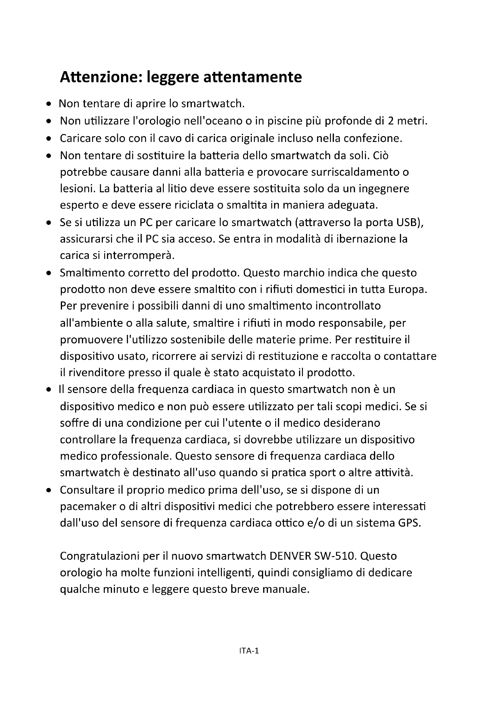 www.facebook.com/denverelectronics ITALIANOITA-1 Attenzione: leggere attentamente Non tentare di aprire lo smartwatch. Non utilizzare l'orologio nell'oceano o in piscine più profonde di 2 metri. Caricare solo con il cavo di carica originale incluso nella confezione. Non tentare di sostituire la batteria dello smartwatch da soli. Ciò potrebbe causare danni alla batteria e provocare surriscaldamento o lesioni. La batteria al litio deve essere sostituita solo da un ingegnere esperto e deve essere riciclata o smaltita in maniera adeguata. Se si utilizza un PC per caricare lo smartwatch (attraverso la porta USB), assicurarsi che il PC sia acceso. Se entra in modalità di ibernazione la carica si interromperà. Smaltimento corretto del prodotto. Questo marchio indica che questo prodotto non deve essere smaltito con i rifiuti domestici in tutta Europa. Per prevenire i possibili danni di uno smaltimento incontrollato all'ambiente o alla salute, smaltire i rifiuti in modo responsabile, per promuovere l'utilizzo sostenibile delle materie prime. Per restituire il dispositivo usato, ricorrere ai servizi di restituzione e raccolta o contattare il rivenditore presso il quale è stato acquistato il prodotto. Il sensore della frequenza cardiaca in questo smartwatch non è un dispositivo medico e non può essere utilizzato per tali scopi medici. Se si soffre di una condizione per cui l'utente o il medico desiderano controllare la frequenza cardiaca, si dovrebbe utilizzare un dispositivo medico professionale. Questo sensore di frequenza cardiaca dello smartwatch è destinato all'uso quando si pratica sport o altre attività. Consultare il proprio medico prima dell'uso, se si dispone di un pacemaker o di altri dispositivi medici che potrebbero essere interessati dall'uso del sensore di frequenza cardiaca ottico e/o di un sistema GPS. Congratulazioni per il nuovo smartwatch DENVER SW-510. Questo orologio ha molte funzioni intelligenti, quindi consigliamo di dedicare qualche minuto e leggere questo breve manuale.ITA-2 Caratteristiche principali: Smartwatch con Bluetooth con funzione GPS e sensore di frequenza cardiaca Modalità Multi-Sport (Corsa, Camminata, arrampicata, ciclismo e corsa indoor) Possibilità di tenere traccia delle prestazioni sportive, visualizzare la frequenza cardiaca e una mappa del proprio percorso Mostra il tempo metereologico e la temperatura Utilizzarlo come pedometro per monitorare i passi quotidiani e la qualità del riposo Sincronizzare la rubrica telefonica e rispondere o rifiutare le chiamate direttamente sull'orologio Visualizzare gli SMS, le email, gli eventi del calendario e l'attività dei social media Riproduzione di musica in remoto, acquisizione remota di foto su smartphone Batteria ai polimeri di litio da 500 mAh con periodo di standby pari a 7-10 giorni Compatibile con iOS7 o versione successiva e Android 4.4 o versione successiva Panoramica Orologio intelligente