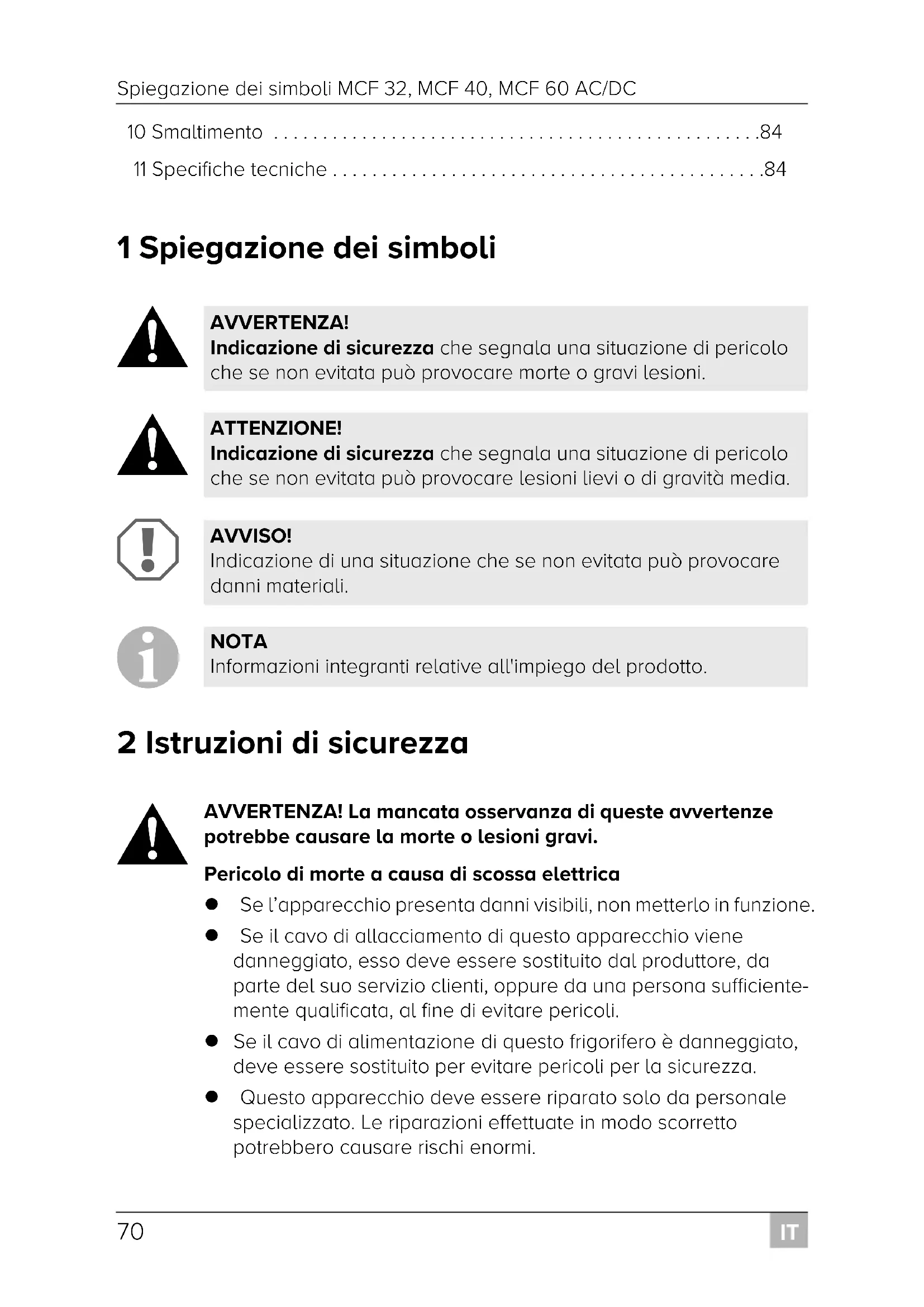 ATTENZIONE! La mancata osservanza di queste precauzioni potrebbe causare lesioni lievi o moderate. Pericolo di morte a causa di scossa elettrica Prima della messa in funzione assicurarsi che la linea di alimentazione e la spina siano asciutte. Staccare l'apparecchio dalla rete – prima di effettuare la pulizia e la cura – dopo ogni utilizzo Pericolo per la salute Controllare che la capacità di raffreddamento dell'apparecchio sia conforme ai requisiti degli alimenti o medicinali che si desi- dera raffreddare. I prodotti alimentari possono essere conservati solo nelle confezioni originali o in contenitori adeguati. L’apertura prolungata del frigorifero può causare un significativo aumento della temperatura nei vani dell’apparecchio. FR34-FR40-FR60_MCF32-MCF40-MCF60_OPM_EMEA16.book Seite 71 Donnerstag, 13. Februar 2020 3:51 15IT Istruzioni di sicurezza MCF 32, MCF 40, MCF 60 AC/DC