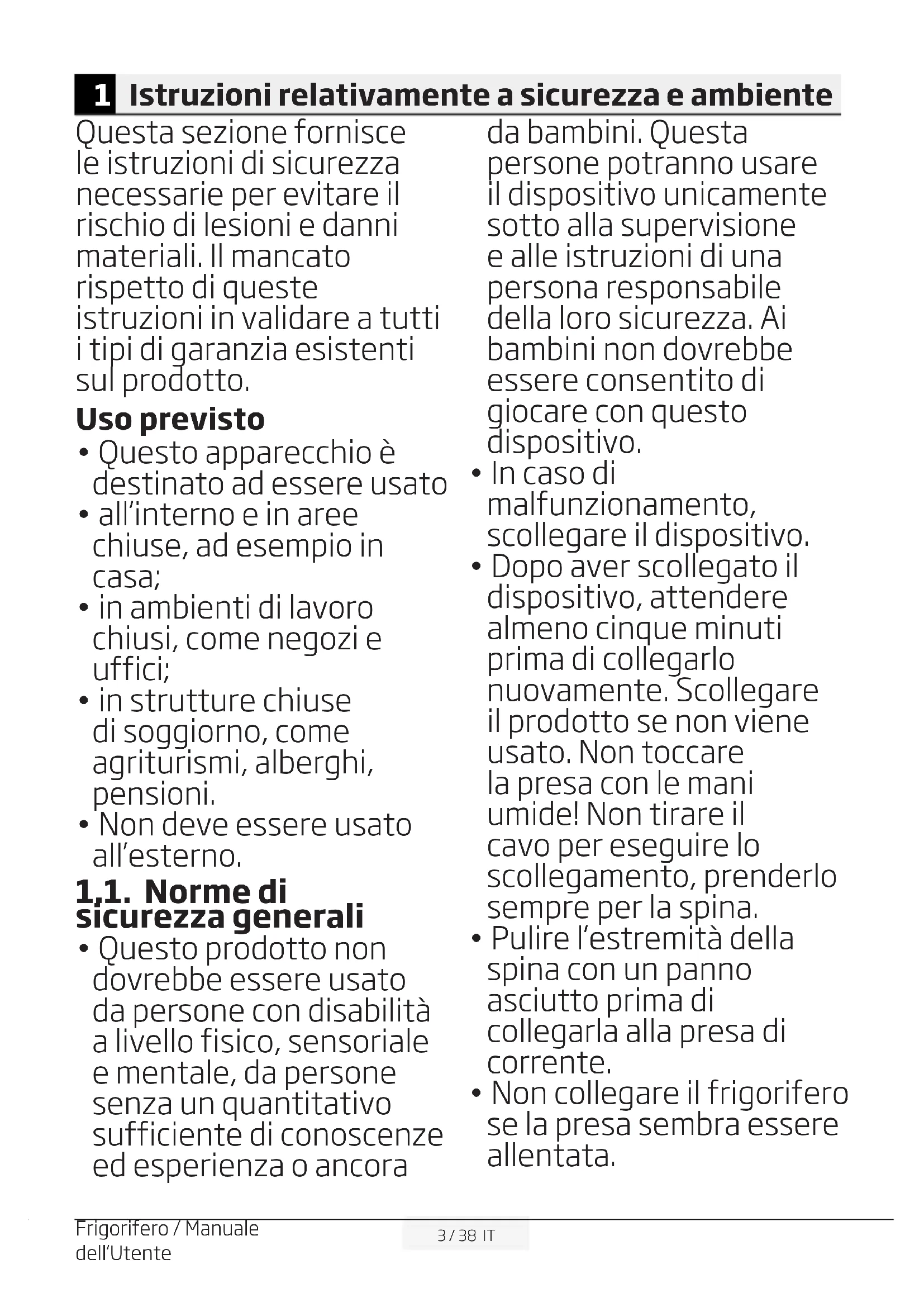 Rischio di scosse elettriche. L’mballaggo del prodotto è fatto d materal rcclabl, n conformtà con la Normatva Ambentale Nazonale.2 / 38 IT Frgorfero / Manuale dell’Utente 1 Istruzioni relativamente a sicurezza e ambiente 3 1.1. Norme di sicurezza generali. . . . . 3