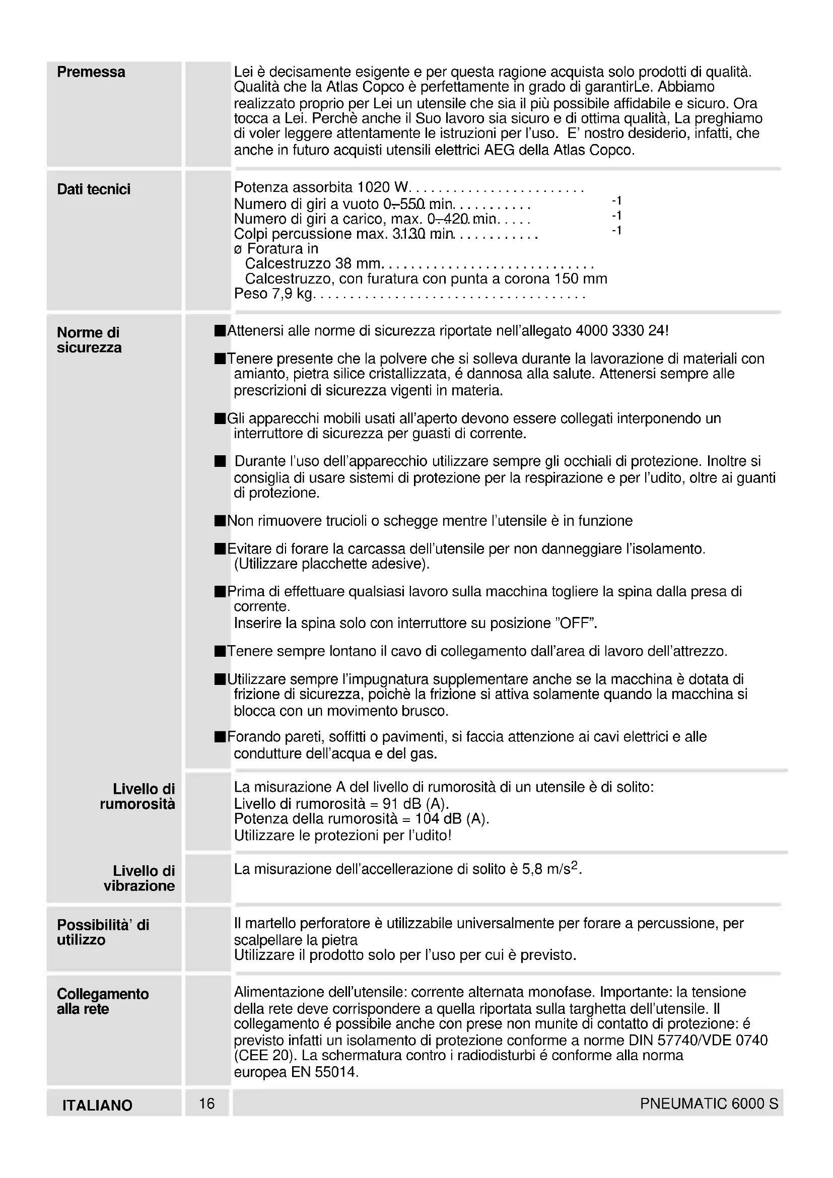 ITALIANO PNEUMATIC 6000 S Accendere: premere l’interruttore principale Spegnere: rilasciare l’interruttore principale. E’ possibile regolare il numero di giri in maniera continua premendo l’interruttore principale. Il limitatore di profondità puó essere usato a scelta a destra o a sinistra dell’impugnatura laterale. Infilare il limitatore di profondità nell’impugnatura laterale fino allo scatto del chiavistello. Per forare alla stessa profondità spingere il limitatore di profondità nelle perforazione dell’arresto del limitatore e fissare la profondità desiderata. L’impugnatura supplementate può essere ruotata, per lfare ciò, sarà sufficiente, come indicato in figura, allentare fare ciò, allentare l’impugnatura stessa come indicato in figura e portala nella posizione desiderata. L’impugnatura laterale può essere usata anche lateralmente all cassa. Questa posizione è adatta per trapanature dal basso (per es. nel terreno) o dall’alto (per es. sul soffitto). Svitare l’impugnatura laterale dall’arresto e poi avvitare lateralmente alla cassa. Accensione– Spegnimento Limitatore di profondità Impugnatura laterale20 ITALIANO PNEUMATIC 6000 S Una maggiore pressione di contatto non migliora la qualità del lavoro! Con una normale pressione il sistema antivibrazioni funziona; il soffietto a pieghe deve essere contratto solo leggermente. Con un’elevata pressione il soffietto a pieghe deve essere molto contratto e le vibrazioni vengono trasmesse sensibilmente all’impugnatura laterale. Estrarre di tanto in tanto la punta dal foro ed eliminare la polvere formatasi in calcestruzzo, laterizi duri, pietra, cemento duro, selezionare la percussione (forare il marmo senza percussione). per piastrelle, superfici pavimentate, laterizi leggeri, calce di cemento, intonaco, selezionare la rotazione. per metalli duri, lavorate con punta normale per forare su superfici lisce (es. piastrelle), é consigliabile posizionare sul punto da forare un nastro adesivo in modo che la punta non scivoli sulla superficie. In caso di percussione insufficiente rivolgersi al servizio di assistenza. Tener sempre ben pulite le fessure di ventilazione dell’apparecchio. Quando le spazzole di carbone sono consumate, l ’utensile si spegne prima che possano insorgere danni al collettore. Se le spazzole di carbone sono rovinate o se la capacità del trapano è ridotta, si prega di contattare uno dei negozi autorizzati AEG. Così si assicura una durata più lunga dell’utensile ed anche un migliore funzionamento. Nella pagina degli ”Indirizzi dei servizi” cercate l’indirizzo del centro assistenza a voi più vicino. Utilizzare esclusivamente accessori e pezzi di ricambio AEG. L’installazione di pezzi di ricambio non specificamente prescritti dall’AEG va preferibilmente effettuata dal servizio di assistenza clienti AEG (ved. opuscolo Garanzia/Indirizzi Assistenza tecnica). In caso di mancanza del disegno esploso, può essere richiesto al seguente indirizzo: Atlas Copco Tools Italia Via Fratelli Gracchi 39, 20092 Cinisello Balsamo Mi. Consultate il nostro catalogo per trovare l ’accessorio più adatto ed il relativo numero di ordinazione.. Istruzioni d’uso Qualche suggerimento Manutenzione Accessori21 ESPAÑOL PNEUMATIC 6000 S Usted exige lo mejor, y ha optado por una calidad profesional – de Atlas Copco. Utilice correctamente su nueva herramienta eléctrica. Está fabricada con todo cuidado, pero primero debe leer las siguientes instrucciones. Una herramienta eléctrica sólo ofrece su mejor rendimiento cuando se maneja adecuadamente. Herramientas Eléctricas AEG de Atlas Copco Potencia nominal 1020 W. . . . . . . . . . . . . . . . . . Velocidad en vacío 0–550 min