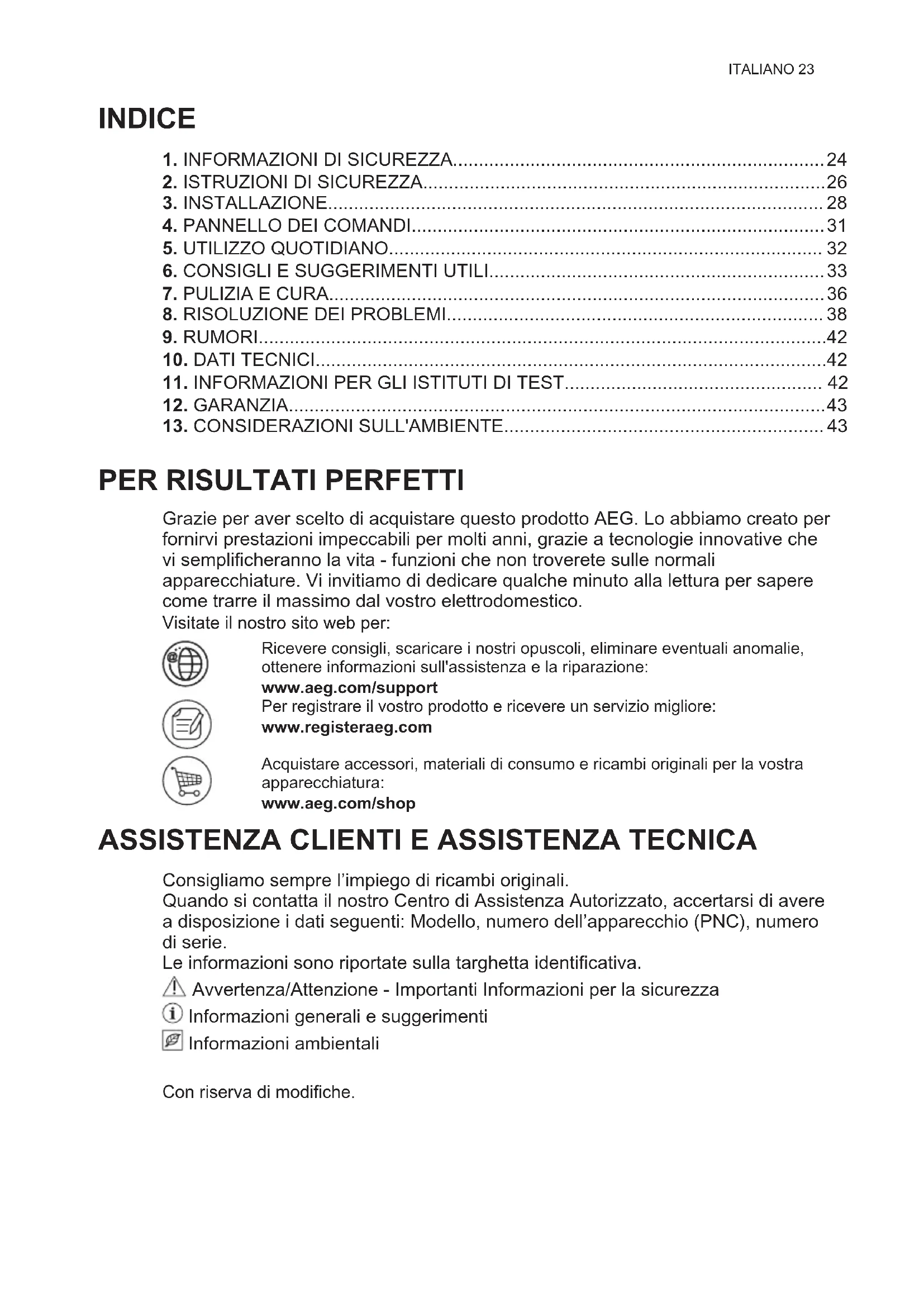 Consigliamo sempre l’impiego di ricambi originali. Quando si contatta il nostro Centro di Assistenza Autorizzato, accertarsi di avere a disposizione i dati seguenti: Modello, numero dell’apparecchio (PNC), numero di serie. Le informazioni sono riportate sulla targhetta identificativa. Avvertenza/Attenzione - Importanti Informazioni per la sicurezza Informazioni generali e suggerimenti Informazioni ambientali Con riserva di modifiche.