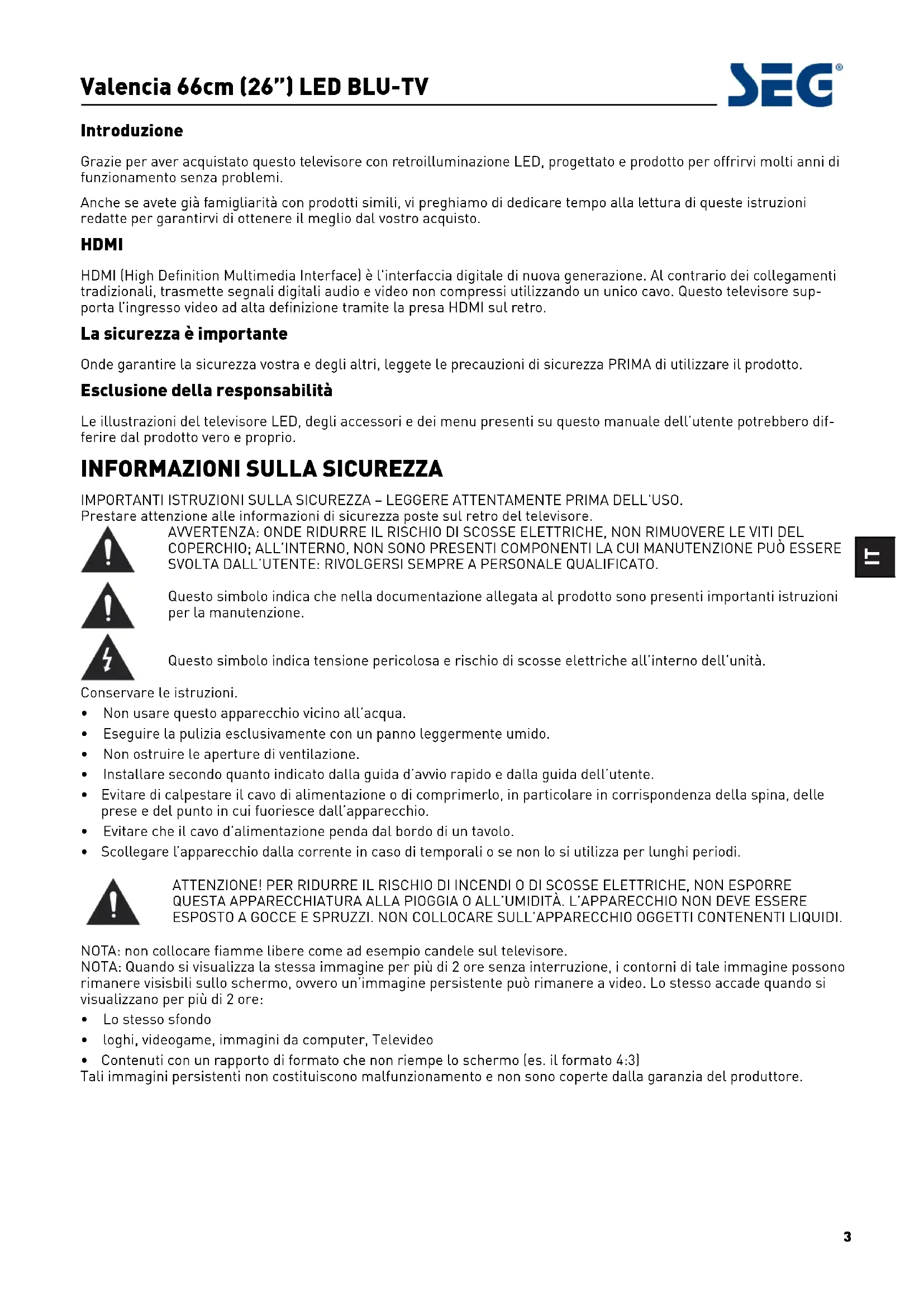 Scarica le istruzioni per il tuo Televisore in formato PDF gratuitamente! Trova il tuo manuale Valencia - SEG e riprendi in mano il tuo dispositivo elettronico. In questa pagina sono pubblicati tutti i documenti necessari per l'utilizzo del tuo dispositivo. Valencia del marchio SEG.