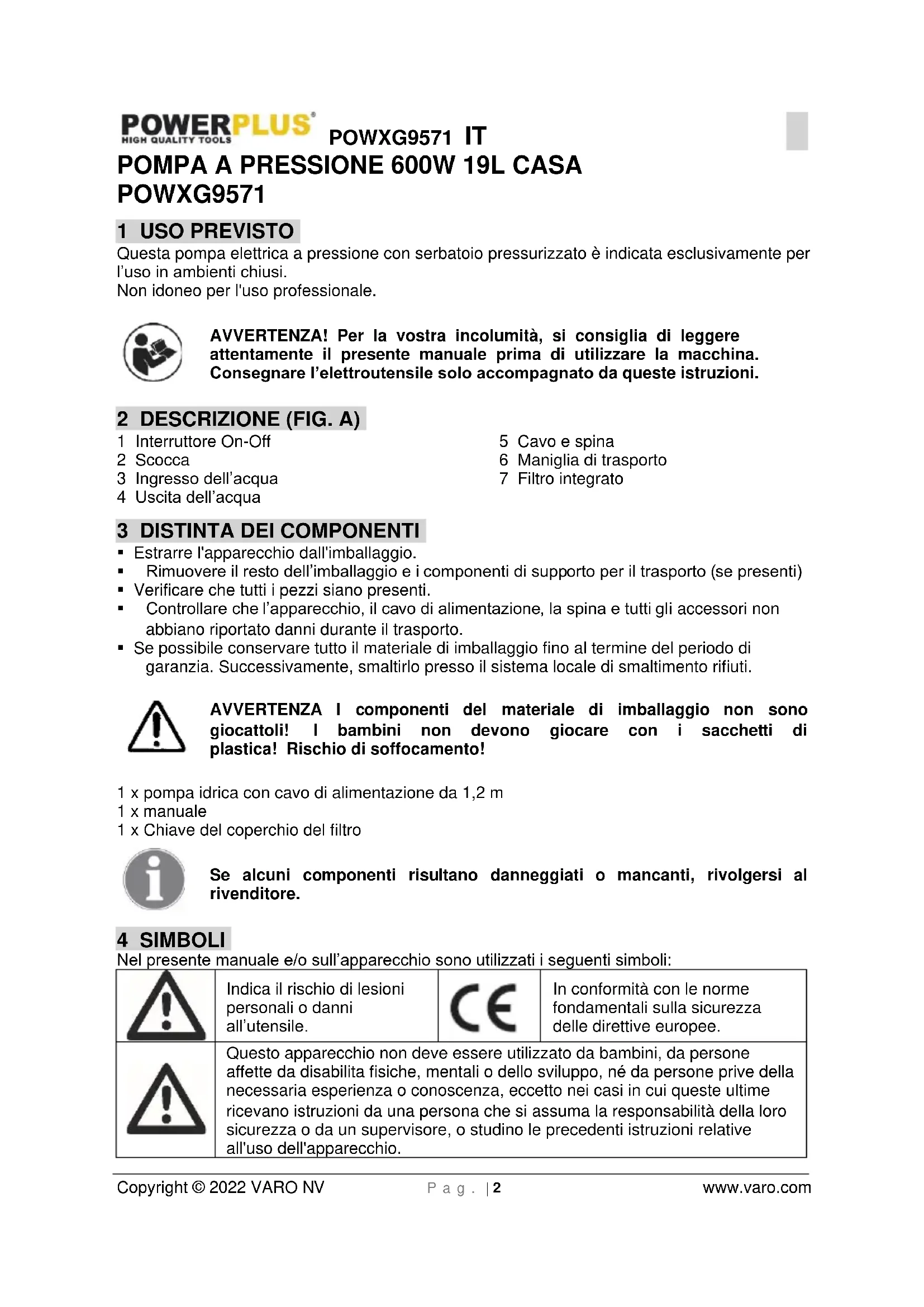 Con la presente, VARO N.V. – Vic. Van Rompuy N.V Joseph Van Instraat 9 – B2500 Lier, Belgio, dichiara che Descrizione dell’apparecchio: Pompa A Pressione 600W 19l Casa Marchio: POWERplus Numero articolo: POWXG9571 è conforme ai requisiti essenziali e alle altre disposizioni pertinenti stabilite dalle Direttive Europee in base all’applicazione delle norme europee armonizzate. Qualsiasi modifica effettuata sul prodotto rende nulla questa dichiarazione. Direttive europee (inclusi eventuali emendamenti fino alla data della firma): 2011/65/EU 2014/35/EU 2014/30/EU 2014/68/EU 2000/14/EC Annex V LwA Measured 81dB(A) Guaranteed 82dB(A) Norme europee armonizzate (inclusi eventuali emendamenti fino alla data della firma): EN60335-1 : 2012 EN60335-2-41 : 2003