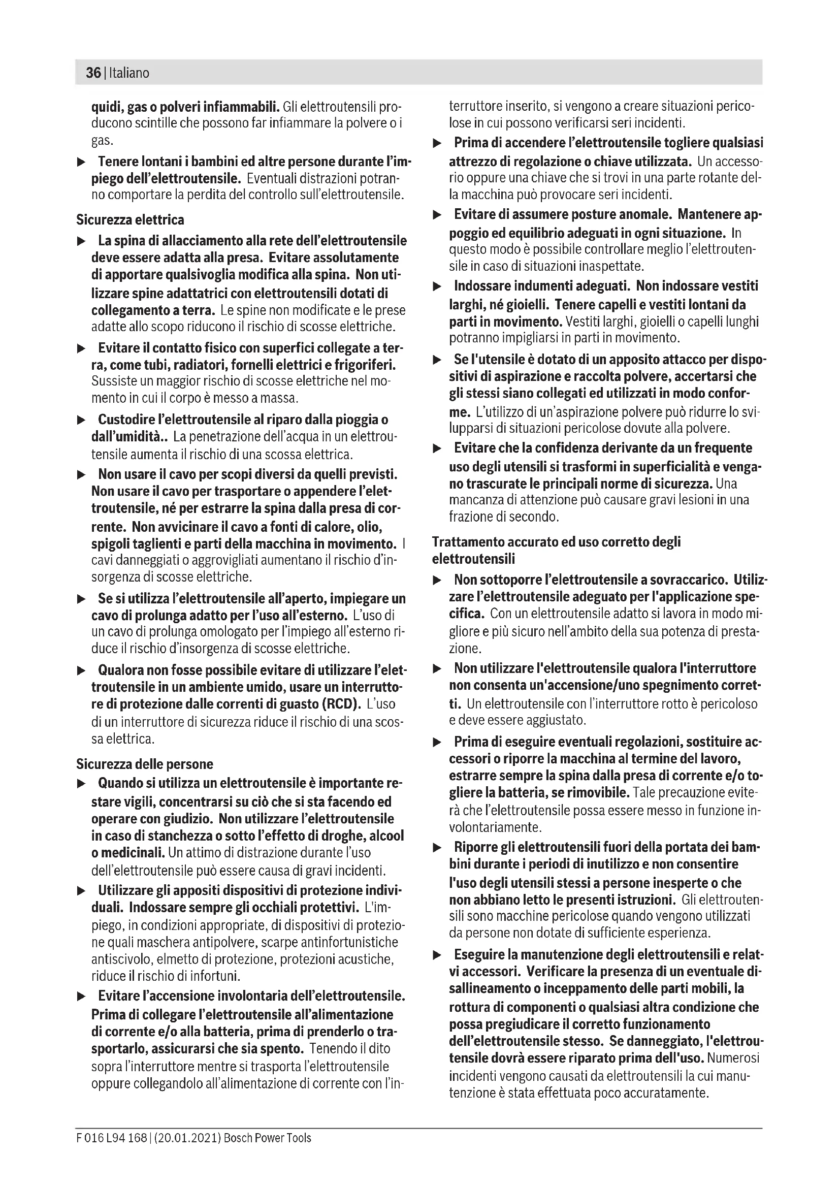 – Lunghezza massima 30 m per cavi di prolunga oppure 60 m per tamburi per cavi con interruttore di sicurezza per correnti di guasto Nota bene: Se si utilizza un cavo di prolunga è necessario che lo stesso, come indicato nelle norme di sicurezza, sia do- tato di un conduttore di protezione che, attraverso la spina, sia collegato al conduttore di protezione del Vostro impianto elettrico. ATTENZIONE: Cavi di prolunga non confor- mi alle norme possono essere pericolosi. I cavi di prolunga, le spine ed i raccordi devo- no essere di tipo impermeabile all’acqua e devono essere omologati per l’uso in ambienti esterni. Simboli I simboli seguenti sono importanti per la lettura e la com- prensione delle istruzioni d’uso. Memorizzare i simboli ed il loro significato. Un’interpretazione corretta dei simboli con- tribuisce ad utilizzare meglio ed in modo più sicuro il prodot- to. Simbolo Significato Mettere i guanti di protezione Direzione di movimento Direzione di reazione Peso F 016 L94 168 | (20.01.2021) Bosch Power ToolsItaliano | 39 Simbolo Significato Accensione Spegnimento CLICK! Rumore percettibile Operazione vietata Accessori/parti di ricambio Descrizione del prodotto e caratteristiche Leggere tutte le indicazioni di sicurezza e le istruzioni operative. La mancata osservanza delle istruzioni e delle indicazioni di sicurezza può essere causa di scosse elettriche, incendi e/o lesioni di grave entità. Osservare le figure nella parte posteriore delle istruzioni per l'uso. Uso conforme alle norme L’apparecchio per il giardinaggio è previsto per tagliare e to- sare siepi e cespugli del Vostro giardino. Componenti illustrati (vedi figure A e B) La numerazione dei componenti si riferisce all’illustrazione del prodotto riportata sulle pagine con la rappresentazione grafica. (1) Impugnatura (superficie di presa isolata) (2) Interruttore di avvio/arresto (3) Pulsante di sicurezza per l’interruttore di avvio/arre- sto (4) Protezione mano (5) Lama (6) Custodia di protezione (7) Spina di rete