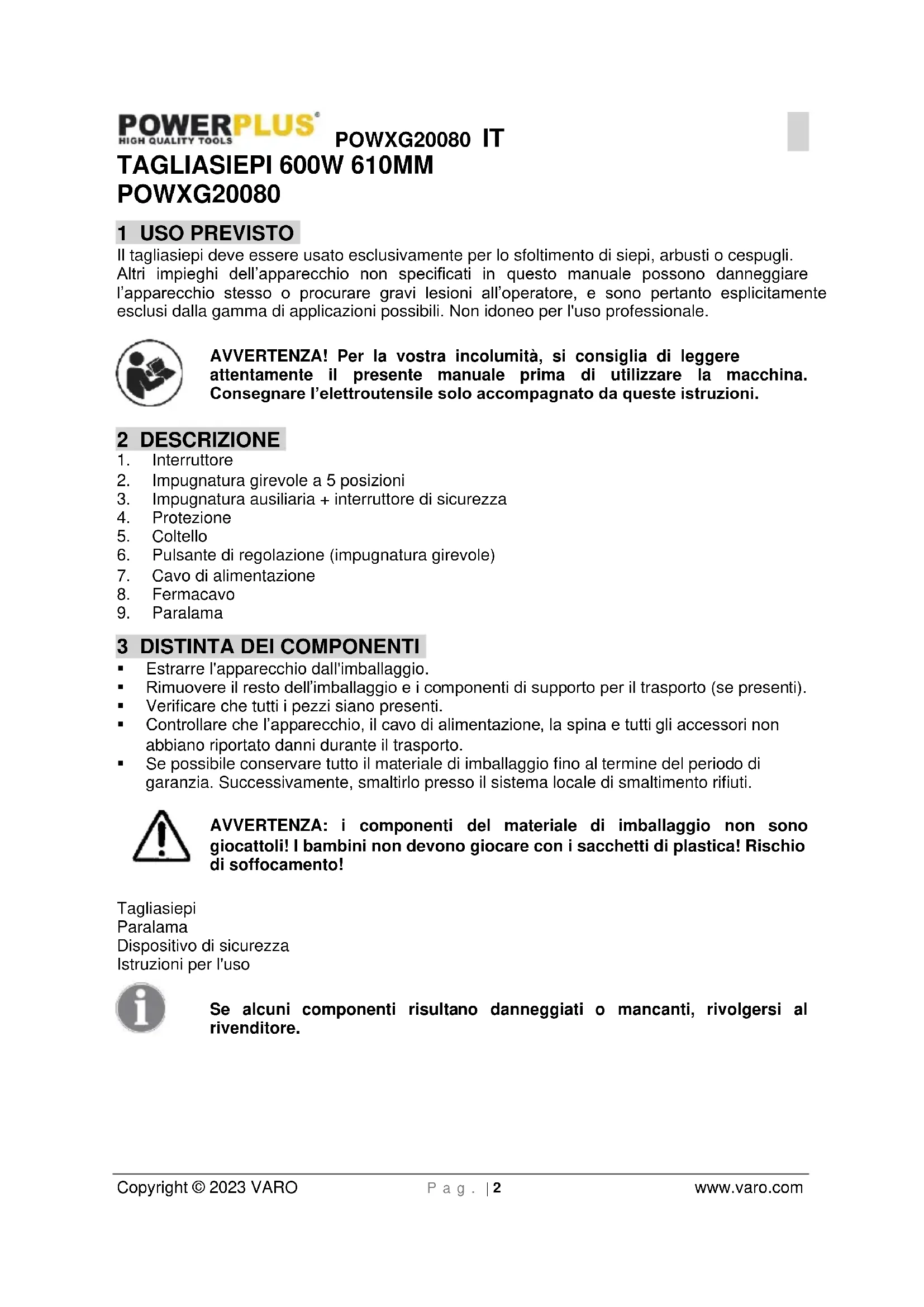 POWXG20080 1 USO PREVISTO Il tagliasiepi deve essere usato esclusivamente per lo sfoltimento di siepi, arbusti o cespugli. Altri impieghi dell’apparecchio non specificati in questo manuale possono danneggiare l’apparecchio stesso o procurare gravi lesioni all’operatore, e sono pertanto esplicitamente esclusi dalla gamma di applicazioni possibili. Non idoneo per l'uso professionale. AVVERTENZA! Per la vostra incolumità, si consiglia di leggere attentamente il presente manuale prima di utilizzare la macchina. Consegnare l’elettroutensile solo accompagnato da queste istruzioni. 2 DESCRIZIONE