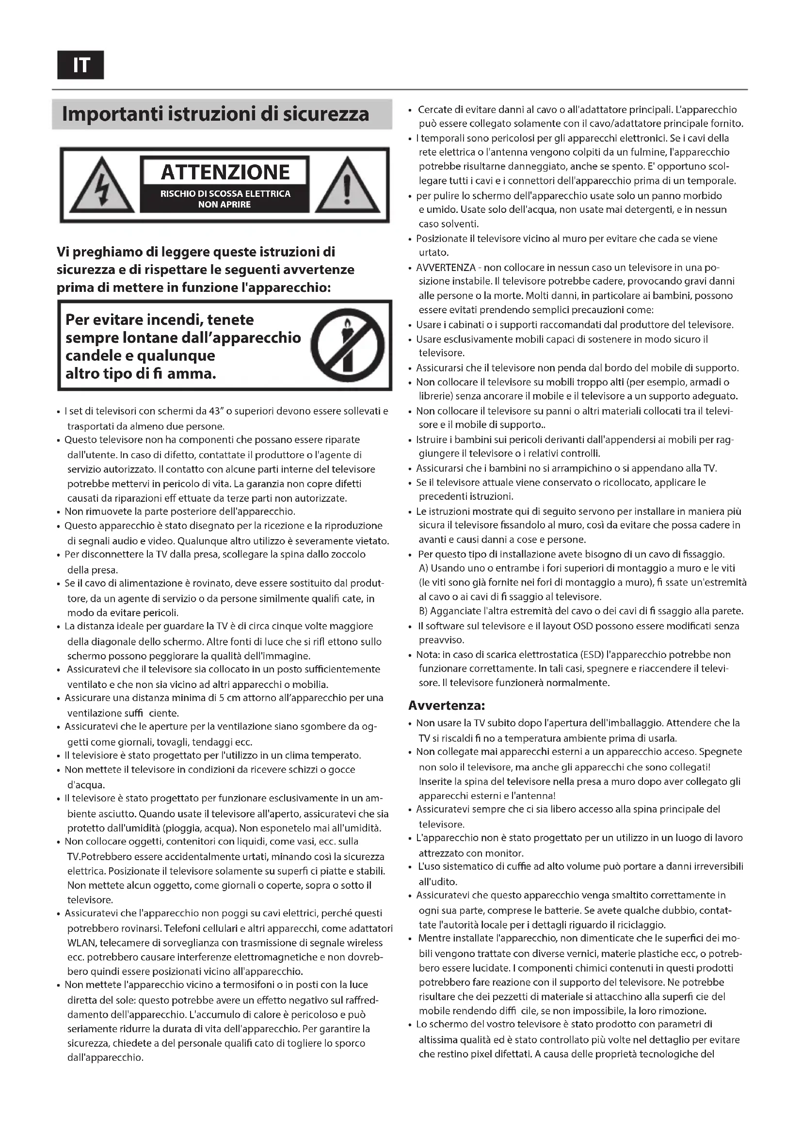 - AVVERTENZA - non collocare in nessun caso un televisore in una po- sizione instabile. Il televisore potrebbe cadere, provocando gravi danni alle persone o la morte. Molti danni, in particolare ai bambini, possono essere evitati prendendo semplici precauzioni come: