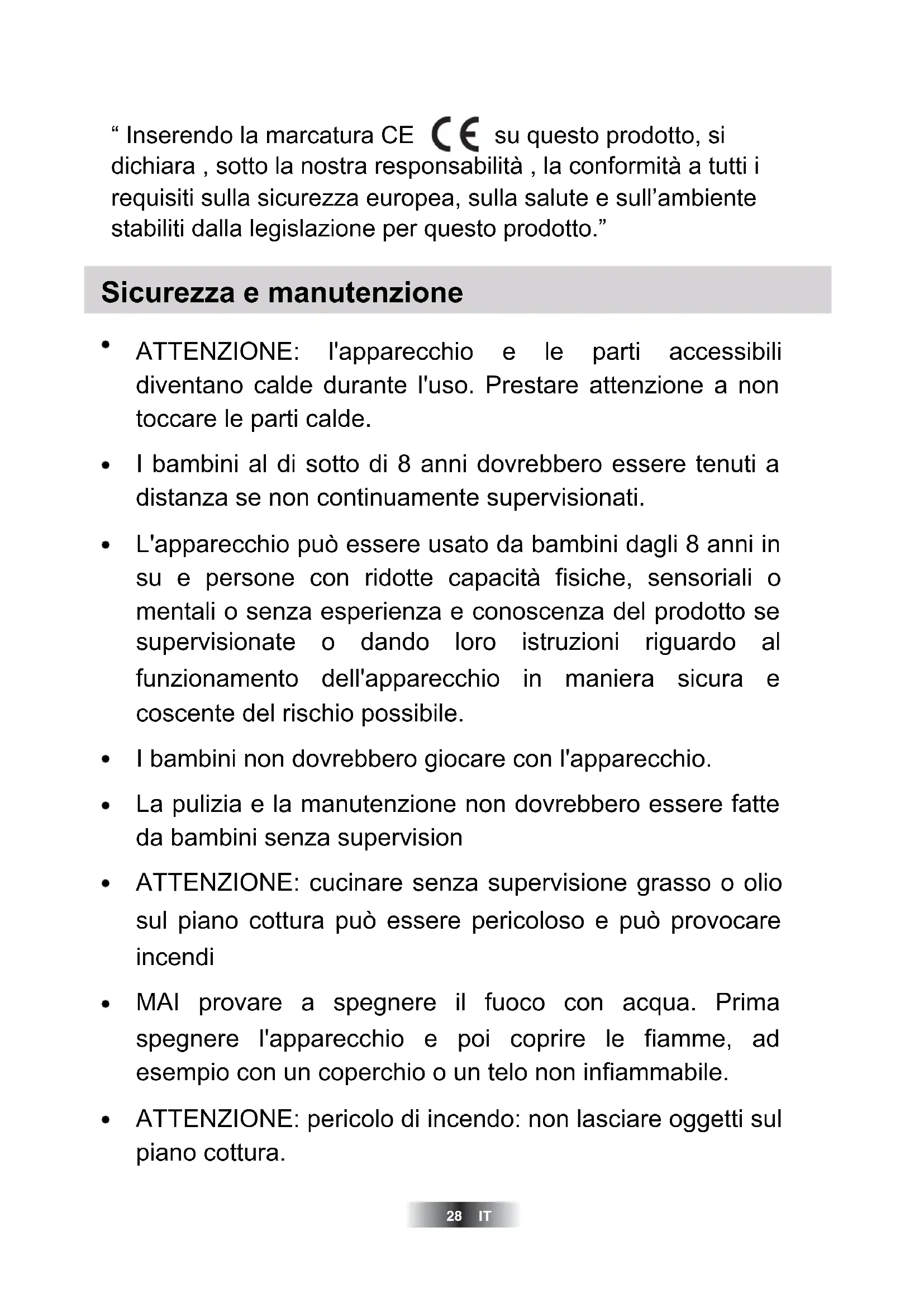 - Los ciclos de on/off varían según el nivel de calor deseado: - nivel bajo: período de funcionamiento breve, - nivel elevado: período de funcionamiento largo 30° Maxi Este electrodoméstico tiene la marca de cumplimiento de la Directiva Europea 2012/ /E sobre Residuos de Aparatos Eléctricos y Electrónicos (RAEE). Asegurando un desguace correcto del aparato, usted puede ayudar a prevenir las consecuencias potenciales negativas para el medio ambiente y la salud de las personas. El símbolo en el aparato, o en los documentos que lo acompañan, indica que el electrodoméstico no debe tratarse como residuo doméstico. El aparato ha de depositarse en un centro de recogida para el reciclaje del equipo eléctrico y electrónico. Deshágase del electrodoméstico cumpliendo las normativa s locales sobre eliminación de residuos. Para más información sobre el tratamiento, recuperación y el reciclaje del electrodoméstico, póngase en contacto con la oficina local competente, el servicio de recogida de residuos domésticos o la tienda donde lo compró. 19 USicurezza e manutenzione 28 IT ATTENZIONE: l'apparecchio e le parti accessibili diventano calde durante l'uso. Prestare attenzione a non toccare le parti calde. I bambini al di sotto di 8 anni dovrebbero essere tenuti a distanza se non continuamente supervisionati. L'apparecchio può essere usato da bambini dagli 8 anni in su e persone con ridotte capacità fisiche, sensoriali o mentali o senza esperienza e conoscenza del prodotto se supervisionate o dando loro istruzioni riguardo al funzionamento dell'apparecchio in maniera sicura e coscente del rischio possibile. I bambini non dovrebbero giocare con l'apparecchio. La pulizia e la manutenzione non dovrebbero essere fatte da bambini senza supervision ATTENZIONE: cucinare senza supervisione grasso o olio sul piano cottura può essere pericoloso e può provocare incendi MAI provare a spegnere il fuoco con acqua. Prima spegnere l'apparecchio e poi coprire le fiamme, ad esempio con un coperchio o un telo non infiammabile. ATTENZIONE: pericolo di incendo: non lasciare oggetti sul piano cottura. “ Inserendo la marcatura CE su questo prodotto, si dichiara , sotto la nostra responsabilità , la conformità a tutti i requisiti sulla sicurezza europea, sulla salute e sull’ambiente stabiliti dalla legislazione per questo prodotto.”29 IT Sicurezza e manutenzione Oggetti metallici quali coltelli, forchette, cucchiai o coperchi non dovrebbero essere posti sulla superficie del piano di cottura perché possono scaldarsi. rimuovere gli eventuali liquidi tracimati dal coperchio prima di aprirlo. Far raffreddare la superficie del piano di cottura prima di chiudere il coperchio. 'RSR O¶XVR VSHJQHUH LO SLDQR GL FRWWXUD WUDPLWH LO VXR dispositivo di comando e non fare affidamento sul rivelatore di pentole. L'apparecchio non è progettato per funzionare con un timer esterno o con un sistema di comando separato . Il mezzo di disconnessione deve essere incorporato nel cablaggio fisso in accordo con le leggi di cablaggio . le istruzioni devono indicare quale tipo di cavo debba essere utilizzato, tenendo presente la temperatura della VXSHUILFLHSRVWHULRUHGHOO¶DSSDUHFFKLR Se il cavo di alimentazione è danneggiato, esso deve essere sostituito dal costruttore o dal suo servizio interferenze Avvertenza: questo apparecchio è conforme alle attuali normative sulla sicurezza e sulla compatibilità elettromagnetica. Ciò nonostante l’uso è sconsigliato ai portatori di pace-maker. è impossibile garantire che tutti gli apparecchi present i sul mercato siano conformi alle attuali normative sulla sicurezza e la compatibilità elettromagnetica e che non si verifichino ATTENZIONE: Se la superficie è incrinata, spegnere O¶DSSDUHFFKLRSHUHYLWDUHODSRVVLELOLWjGLVFRVVHHOHWWULFKH non utilizzare un pulitore a vapore.30 IT Siamo costantemente impegnati nel miglioramento della qualità del prodotto e tale impegno ci autorizza ad apportare modifiche all’apparecchio per integrare le ultime innovazioni tecniche. Le piastre a induzione sono conformi alle Direttive Europee 73/23/CEE e 89/336/CEE, sostituite da 2006/95/EC e 2004/108/EC e successivi emendamenti. LEGGERE ATTENTAMENTE IL LIBRETTO DI ISTRUZIONI PER OTTENERE LE MIGLIORI PRESTAZIONI DALLA PIASTRA. Si consiglia di conservare il li bretto di istru zioni per eventuali consultazioni in futuro. Prima di installare la piastra, annotare il numero di serie qualora fosse necessario ricorrere al servizio di assistenza. Targhetta di identificazione (ubicata sotto la scocca inferiore della piastra) AVVERTENZE GENERALI