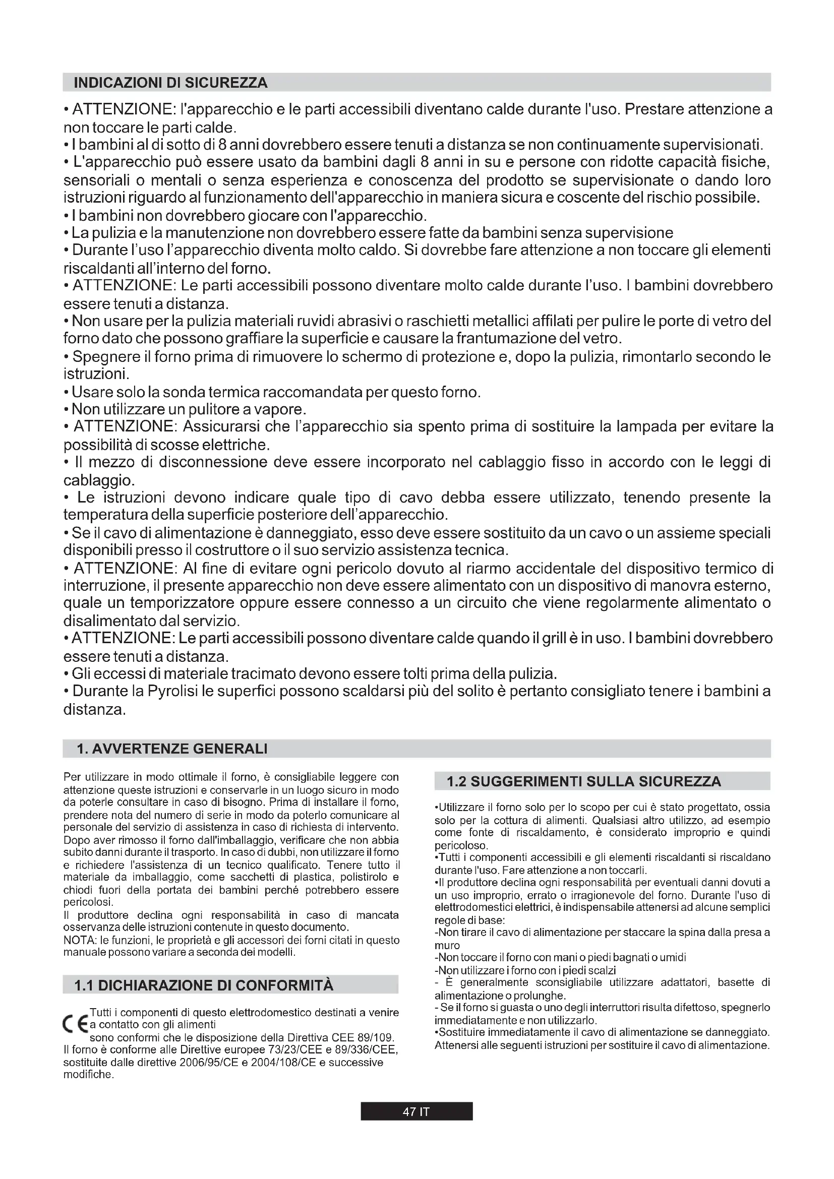 Tutti i componenti di questo elettrodomestico destinati a venire a contatto con gli alimenti sono conformi che le disposizione della Direttiva CEE 89/109. Il forno è conforme alle Direttive europee 73/23/CEE e 89/336/CEE, sostituite dalle direttive 2006/95/CE e 2004/108/CE e successive modifiche.
