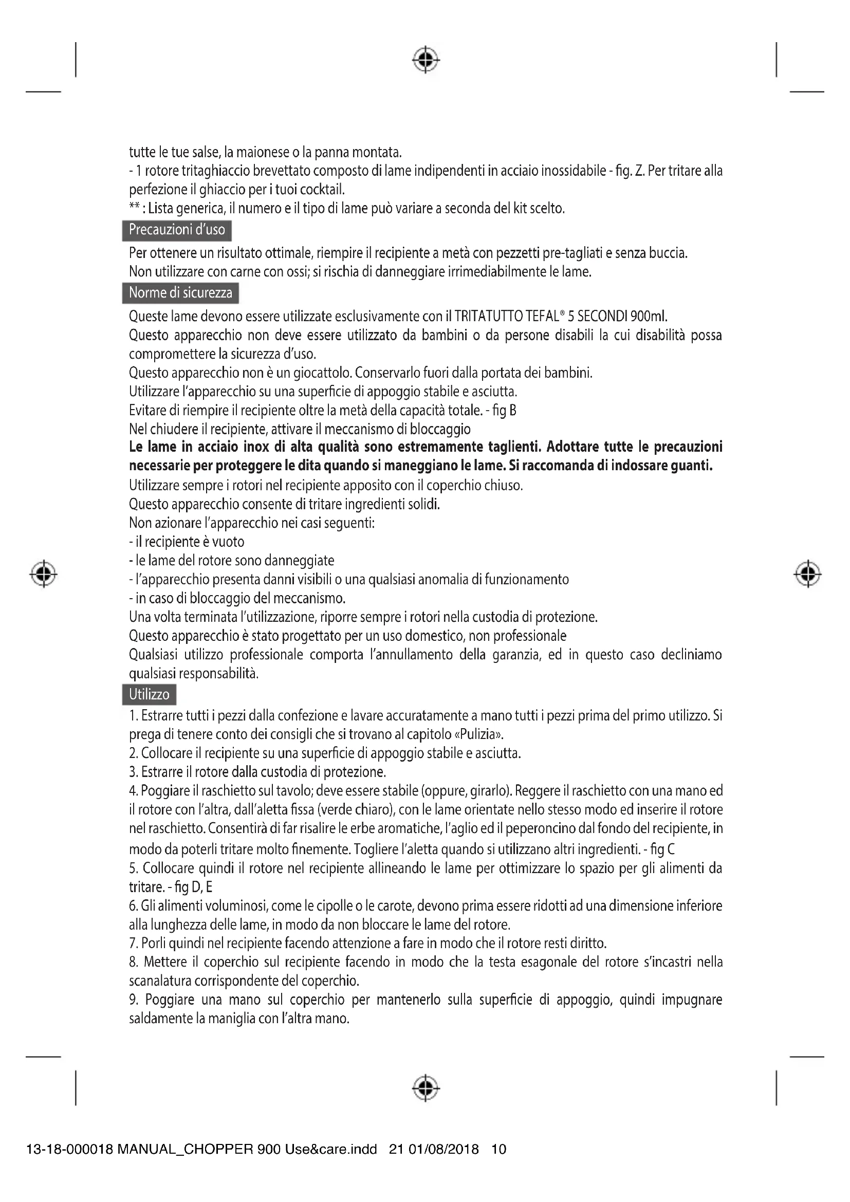 : g A - 1 recipiente antiscivolo della capacità di 900ml - 1 coperchio che integra il meccanismo di trazione ed un sistema di bloccaggio - 1 rotore brevettato composto da due lame indipendenti in acciaio inox - g W; per tritare frutta, verdure, noci ed erbe aromatiche (mele, fragole, pomodori, cetriolo, noci, prezzemolo, ...). - 1 raschietto da ssare sotto il rotore per tagliare le erbe e aerare la preparazione - g C. -1 rotore brevettato per tagliare e pestare, composto di lame indipendenti in acciaio inossidabile - g X. Per tagliare tutta la tua frutta, verdura, frutta a guscio ed erbe (mele, fragole, pomodori, frutta a guscio, erbe…). - 1 rotore brevettato per salse composto di lame indipendenti in acciaio inossidabile - g. Y. Per emulsionare CST-13-18-000018 MANUAL_CHOPPER 900 Use&care.indd 20 01/08/2018 10:57tutte le tue salse, la maionese o la panna montata. - 1 rotore tritaghiaccio brevettato composto di lame indipendenti in acciaio inossidabile - g. Z. Per tritare alla perfezione il ghiaccio per i tuoi cocktail. ** : Lista generica, il numero e il tipo di lame può variare a seconda del kit scelto. Precauzioni d’uso Per ottenere un risultato ottimale, riempire il recipiente a metà con pezzetti pre-tagliati e senza buccia. Non utilizzare con carne con ossi; si rischia di danneggiare irrimediabilmente le lame. Norme di sicurezza Queste lame devono essere utilizzate esclusivamente con il TRITATUTTO TEFAL® 5 SECONDI 900ml. Questo apparecchio non deve essere utilizzato da bambini o da persone disabili la cui disabilità possa compromettere la sicurezza d’uso. Questo apparecchio non è un giocattolo. Conservarlo fuori dalla portata dei bambini. Utilizzare l’apparecchio su una supercie di appoggio stabile e asciutta. Evitare di riempire il recipiente oltre la metà della capacità totale. - g B Nel chiudere il recipiente, attivare il meccanismo di bloccaggio Le lame in acciaio inox di alta qualità sono estremamente taglienti. Adottare tutte le precauzioni necessarie per proteggere le dita quando si maneggiano le lame. Si raccomanda di indossare guanti. Utilizzare sempre i rotori nel recipiente apposito con il coperchio chiuso. Questo apparecchio consente di tritare ingredienti solidi. Non azionare l’apparecchio nei casi seguenti: - il recipiente è vuoto - le lame del rotore sono danneggiate - l’apparecchio presenta danni visibili o una qualsiasi anomalia di funzionamento - in caso di bloccaggio del meccanismo. Una volta terminata l’utilizzazione, riporre sempre i rotori nella custodia di protezione. Questo apparecchio è stato progettato per un uso domestico, non professionale Qualsiasi utilizzo professionale comporta l’annullamento della garanzia, ed in questo caso decliniamo qualsiasi responsabilità. Utilizzo