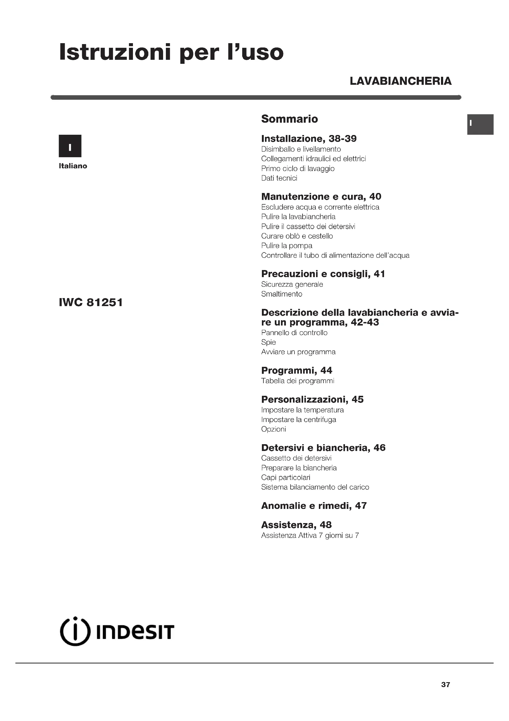 Italiano Sommario Installazione, 38-39 Disimballo e livellamento Collegamenti idraulici ed elettrici Primo ciclo di lavaggio Dati tecnici Manutenzione e cura, 40 Escludere acqua e corrente elettrica Pulire la lavabiancheria Pulire il cassetto dei detersivi Curare oblò e cestello Pulire la pompa Controllare il tubo di alimentazione dell’acqua Precauzioni e consigli, 41 Sicurezza generale Smaltimento Descrizione della lavabiancheria e avvia- re un programma, 42-43 Pannello di controllo Spie Avviare un programma Programmi, 44 Tabella dei programmi Personalizzazioni, 45 Impostare la temperatura Impostare la centrifuga Opzioni Detersivi e biancheria, 46 Cassetto dei detersivi Preparare la biancheria Capi particolari Sistema bilanciamento del carico Anomalie e rimedi, 47 Assistenza, 48 Assistenza Attiva 7 giorni su 7