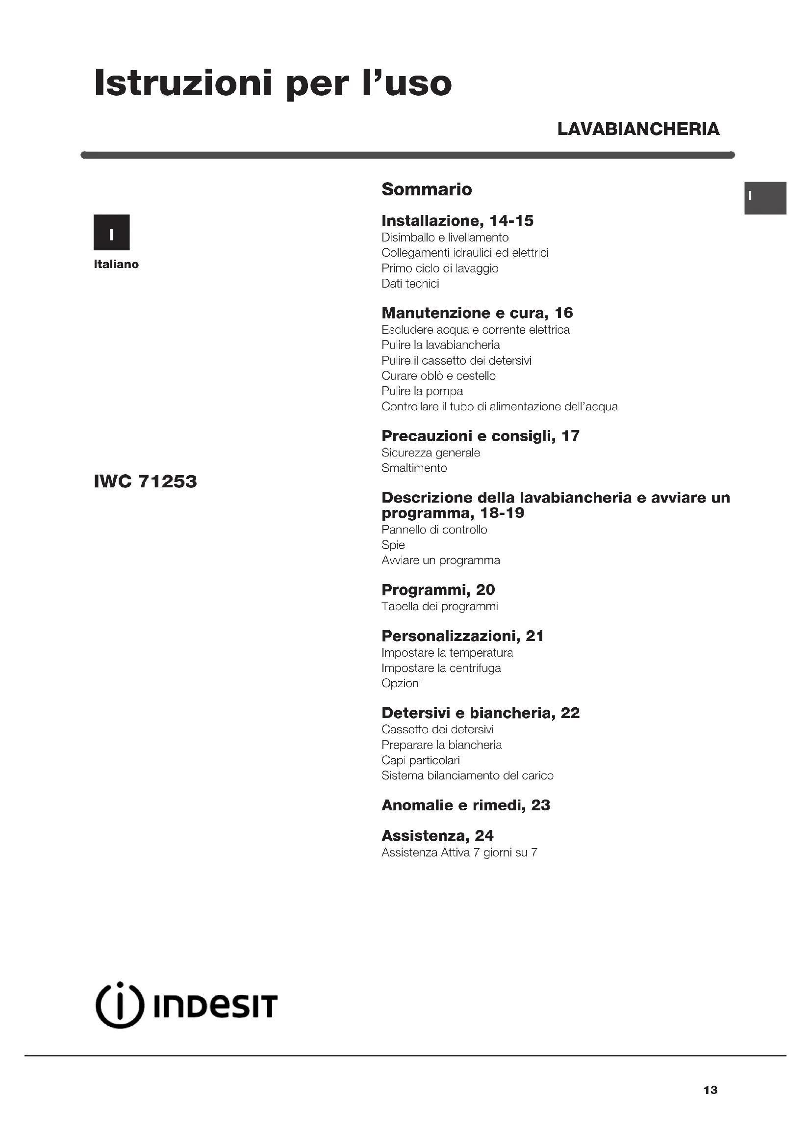 Italiano Sommario Installazione, 14-15 Disimballo e livellamento Collegamenti idraulici ed elettrici Primo ciclo di lavaggio Dati tecnici Manutenzione e cura, 16 Escludere acqua e corrente elettrica Pulire la lavabiancheria Pulire il cassetto dei detersivi Curare oblò e cestello Pulire la pompa Controllare il tubo di alimentazione dell’acqua Precauzioni e consigli, 17 Sicurezza generale Smaltimento Descrizione della lavabiancheria e avviare un programma, 18-19 Pannello di controllo Spie Avviare un programma Programmi, 20 Tabella dei programmi Personalizzazioni, 21 Impostare la temperatura Impostare la centrifuga Opzioni Detersivi e biancheria, 22 Cassetto dei detersivi Preparare la biancheria Capi particolari Sistema bilanciamento del carico Anomalie e rimedi, 23 Assistenza, 24 Assistenza Attiva 7 giorni su 7