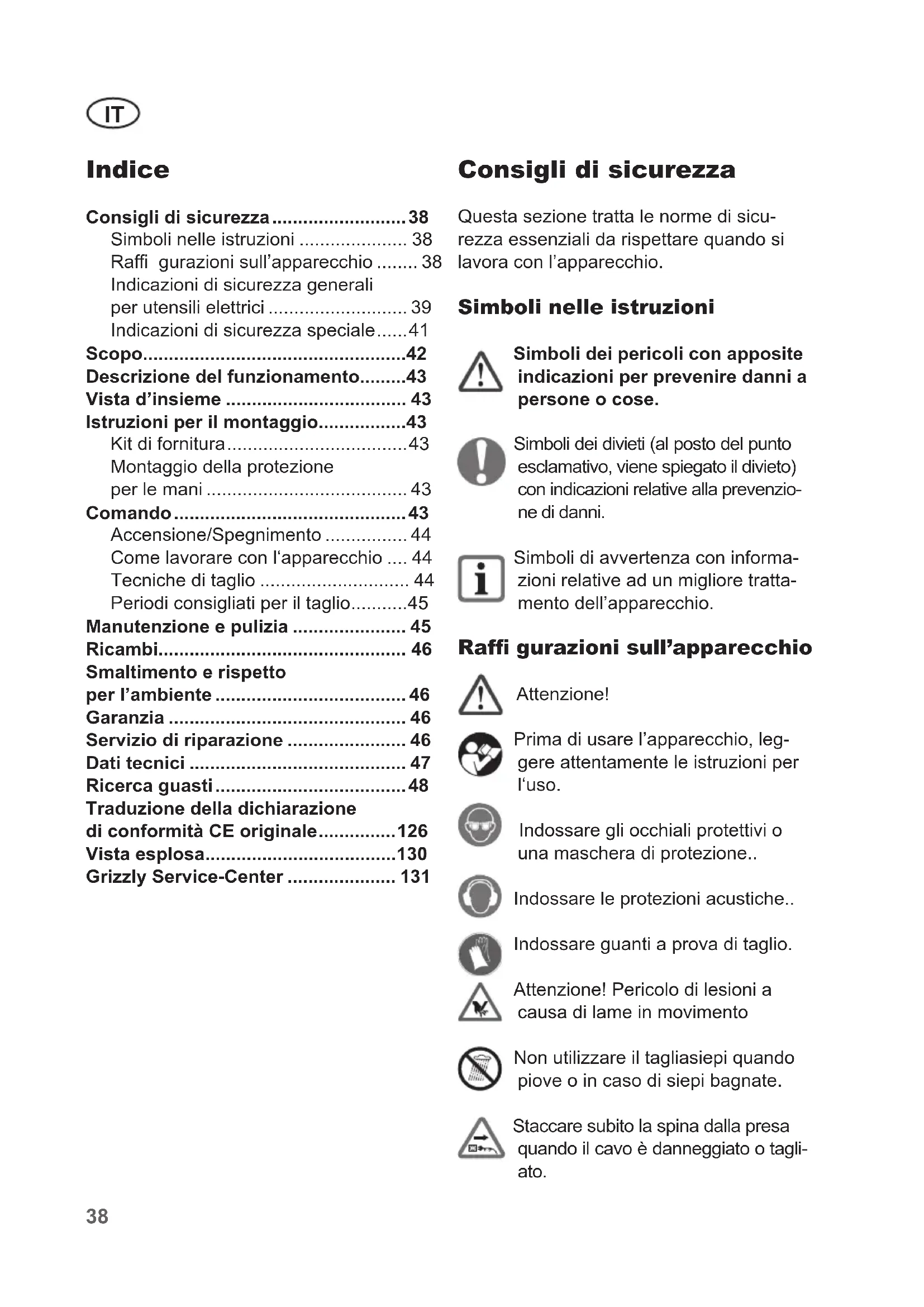 - Conservare il tagliasiepi asciutto nella custodia in dotazione e tenerlo lontano dalla portata dei bambini. Ricambi È possibile ordinare pezzi di ricambio e accessori all’indirizzo www.grizzly-service.eu Se non si dispone di una connessione Internet, contattare telefonicamente il centro di assistenza (vedere “Grizzly Service-Center”). Tenere a portata di mano i numeri d’ordine riportati in basso. Specicare sull’ordine il tipo di macchina e il numero componente riportato sul dise- gno esploso. Smaltimento e rispetto per l’ambiente Eettuare lo smaltimento dell’apparec- chio, degli accessori e della confezione nel rispetto dell’ambiente presso un punto di raccolta per riciclaggio. Le apparecchiature non si devono smaltire insieme ai riuti domestici. Consegnare l’apparecchio a un centro di riciclaggio: le parti in plastica e quelle in metallo, riutilizzate, possono essere sepa- rate le une dalle altre e quindi riutilizzate. Chiedere a tal proposito al nostro servizio di assistenza. Lo smaltimento degli apparecchio difettosi consegnati viene eettuato gratuitamente. Garanzia Per questo apparecchio forniamo 24 mesi di garanzia. Questo apparecchio non è adatto per l’u- so industriale. In caso di un impiego per uso industriale decade la garanzia. Tutti i danni dovuti a usura naturale, so- vraccarico o uso improprio, restano esclu- si dalla garanzia. Determinati componenti soggiacciono a una usura normale e re- stano esclusi dalla garanzia. Si intendono in particolare i proli con lama, gli eccen- trici e i carboncini, sempre che i danni non siano da attribuire a difetti nel materiale. Il requisito necessario per l’ottenimento della garanzia è l’osservanza delle norme di pulizia e manutenzione riportate nelle istruzioni per l’uso. Ogni danno causato da difetti nei materiali o nella costruzione verrà eliminato tramite la fornitura di un apparecchio sostitutivo o tramite ripara- zione. L’unica condizione a tale scopo è che l’apparecchio venga riconsegnato al rivenditore non smontato e corredato di dimostrazione dell’acquisto e di certicato di garanzia. Servizio di riparazione Ogni altra riparazione non in garanzia potrà essere eettuata a pagamento dai nostri centri di assistenza clienti. I nostri centri di assistenza clienti saranno lieti di fornire un preventivo di costo. Possiamo occuparci e riparare solo appa- recchi che siano stati spediti con sucien- te imballo e con trasporto pagato.47