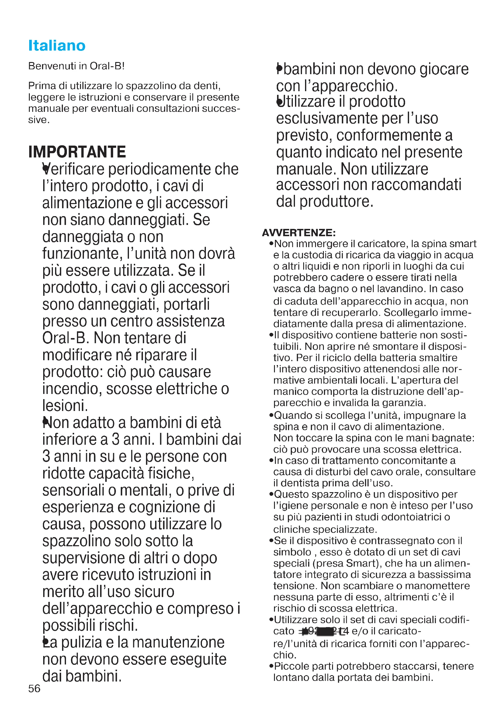 Non adatto a bambini di età inferiore a 3 anni. I bambini dai 3 anni in su e le persone con ridotte capacità fisiche, sensoriali o mentali, o prive di esperienza e cognizione di causa, possono utilizzare lo spazzolino solo sotto la supervisione di altri o dopo avere ricevuto istruzioni in merito all’uso sicuro dell’apparecchio e compreso i possibili rischi.