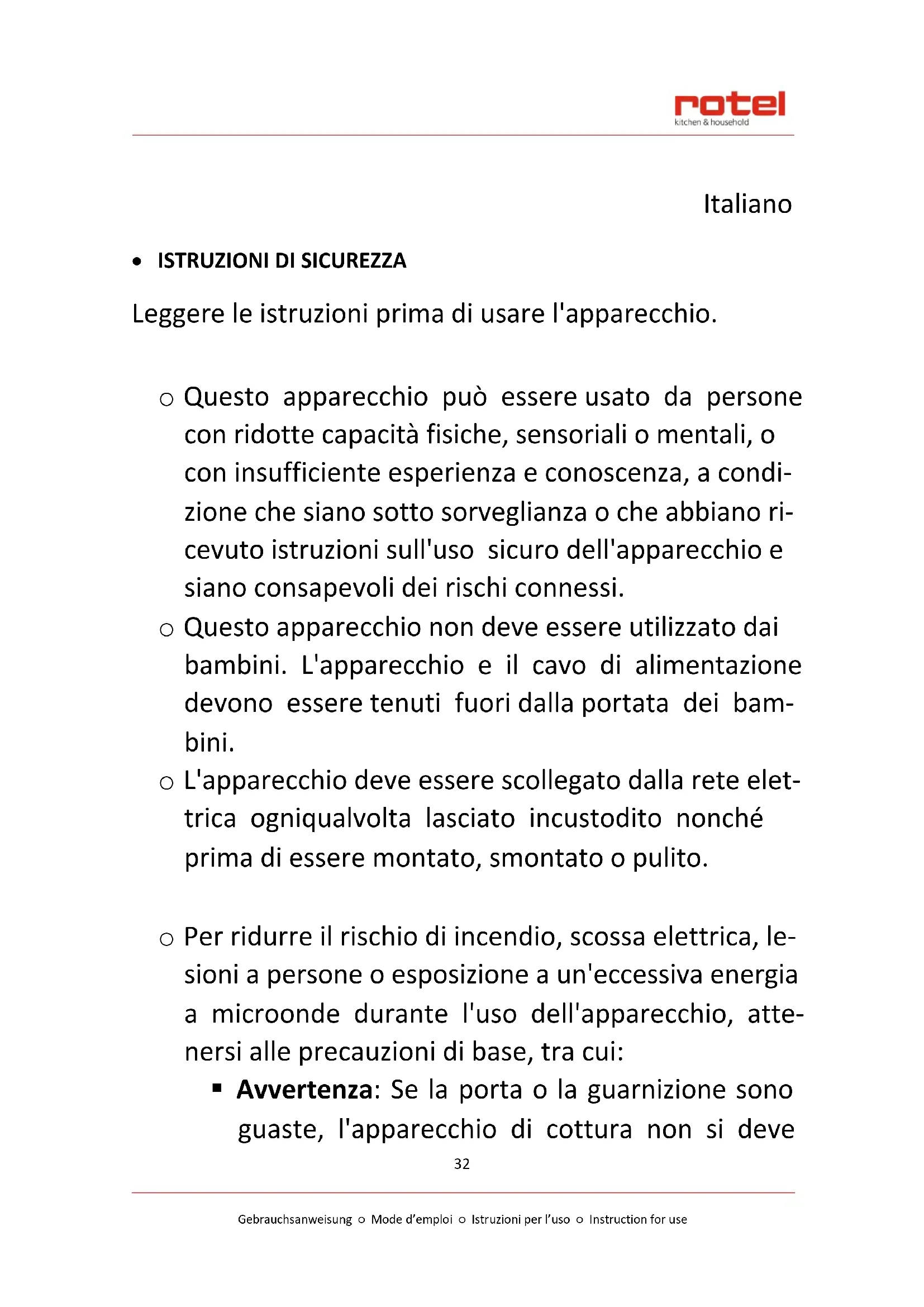 - ISTRUZIONI DI SICUREZZA Leggere le istruzioni prima di usare l'apparecchio. o Questo apparecchio può essere usato da persone con ridotte capacità fisiche, sensoriali o mentali, o con insufficiente esperienza e conoscenza, a condi- zione che siano sotto sorveglianza o che abbiano ri- cevuto istruzioni sull'uso sicuro dell'apparecchio e siano consapevoli dei rischi connessi. o Questo apparecchio non deve essere utilizzato dai bambini. L'apparecchio e il cavo di alimentazione devono essere tenuti fuori dalla portata dei bam- bini. o L'apparecchio deve essere scollegato dalla rete elet- trica ogniqualvolta lasciato incustodito nonché prima di essere montato, smontato o pulito. o Per ridurre il rischio di incendio, scossa elettrica, le- sioni a persone o esposizione a un'eccessiva energia a microonde durante l'uso dell'apparecchio, atte- nersi alle precauzioni di base, tra cui: Avvertenza: Se la porta o la guarnizione sono guaste, l'apparecchio di cottura non si deveGebrauchsanweisung ○ Mode d’emploi ○ Istruzioni per l’uso ○ Instruction for use