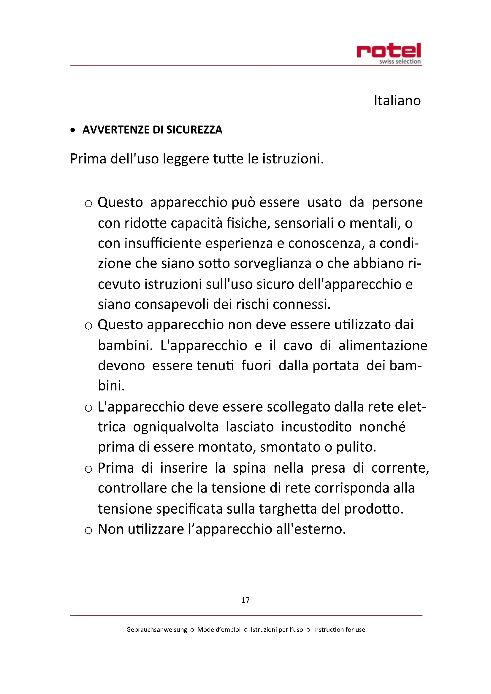 - AVVERTENZE DI SICUREZZA Prima dell'uso leggere tutte le istruzioni. o Questo apparecchio può essere usato da persone con ridotte capacità fisiche, sensoriali o mentali, o con insufficiente esperienza e conoscenza, a condi- zione che siano sotto sorveglianza o che abbiano ri- cevuto istruzioni sull'uso sicuro dell'apparecchio e siano consapevoli dei rischi connessi. o Questo apparecchio non deve essere utilizzato dai bambini. L'apparecchio e il cavo di alimentazione devono essere tenuti fuori dalla portata dei bam- bini. o L'apparecchio deve essere scollegato dalla rete elet- trica ogniqualvolta lasciato incustodito nonché prima di essere montato, smontato o pulito. o Prima di inserire la spina nella presa di corrente, controllare che la tensione di rete corrisponda alla tensione specificata sulla targhetta del prodotto. o Non utilizzare l’apparecchio all'esterno.Gebrauchsanweisung ○ Mode d’emploi ○ Istruzioni per l’uso ○ Instruction for use